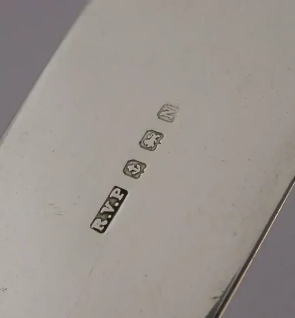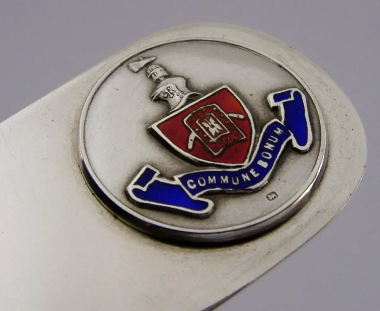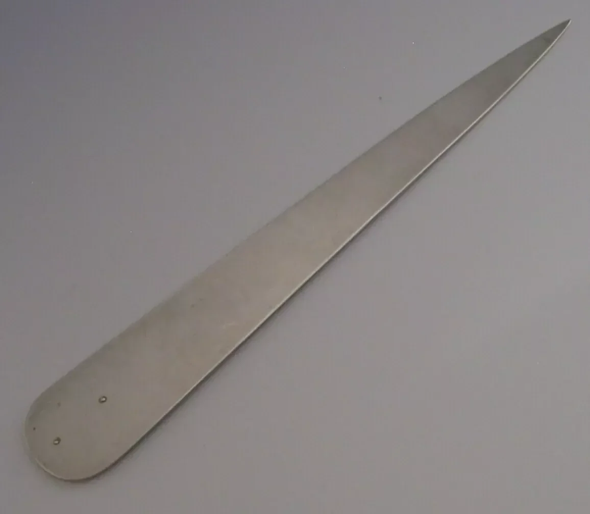 A very interesting English Art Deco solid sterling silver and enamel letter opener. It is hallmarked for Birmingham 1937 with the maker’s marks being RVP. It has been superbly made with the terminal being in the form of the crest which is on New Oxford House Birmingham, I do not know why. It is in superb condition being free from dings splits distortions and repairs. The enamel is perfect. It measures approx. 9.25 inches (23.2cm) long by 1.5 inches (3.6cm) and weighs 48 grams. A very well designed piece.