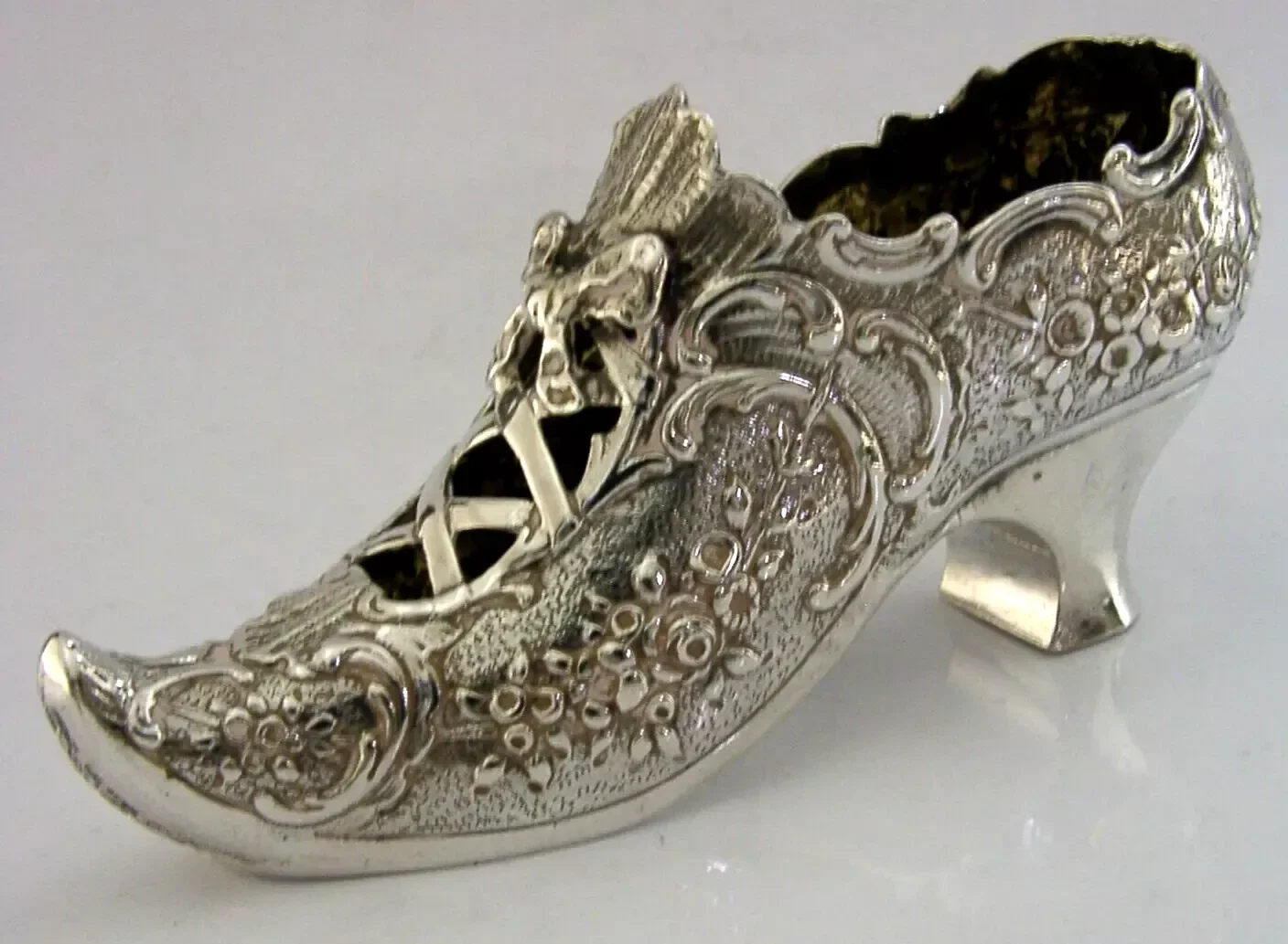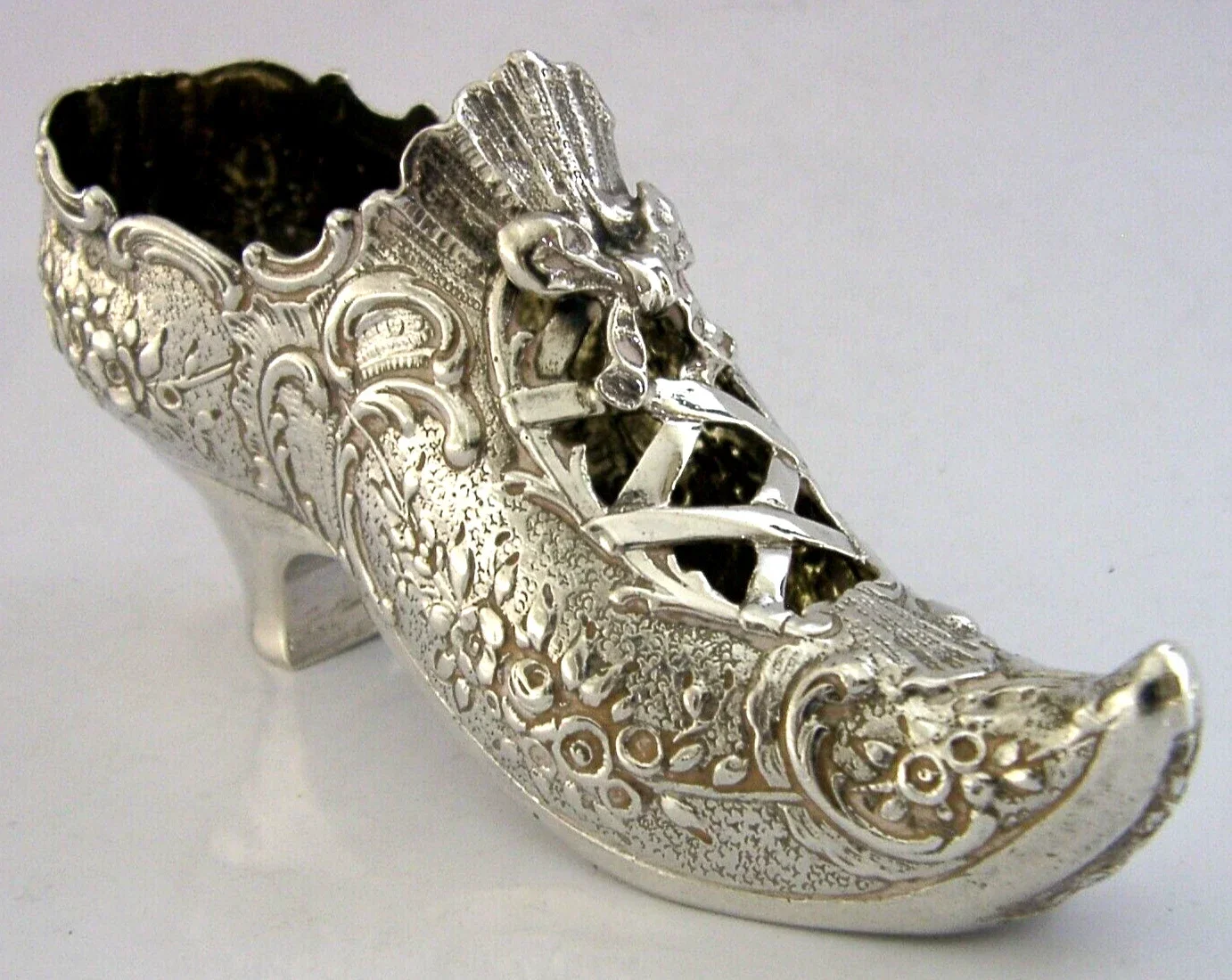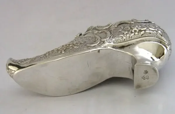 A rare super quality good sized German Hanau solid sterling silver shoe. It is hallmarked with German Hanau marks along with the English imported marks for London 1906 with the importer being John George Piddington. It has been superbly designed being in the form of a shoe decorated with scrolls (it would make a very impressive pin cushion if lined). It is in super condition being free from dings splits holes distortions and repairs. It measures approx. 4.75 inches (12.2cm) long by 1.5 inches (3.8cm) wide by 2 inches (5.1cm) wide and weighs 82 grams. A high quality rare and unusual example.
