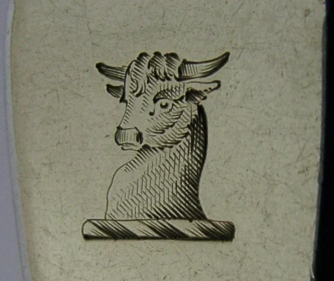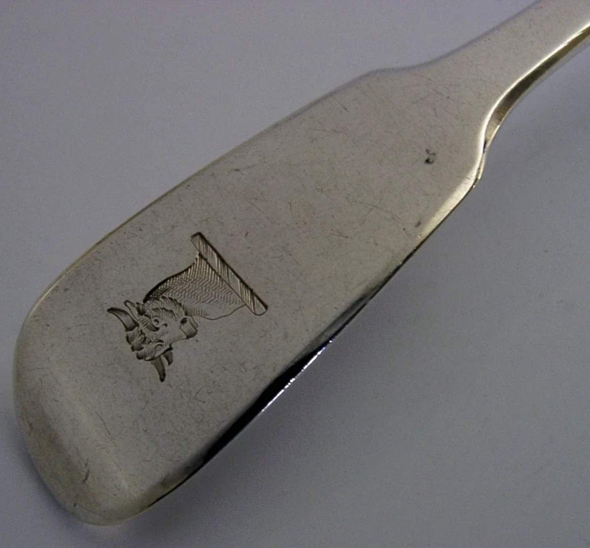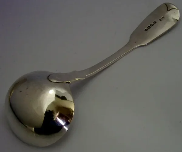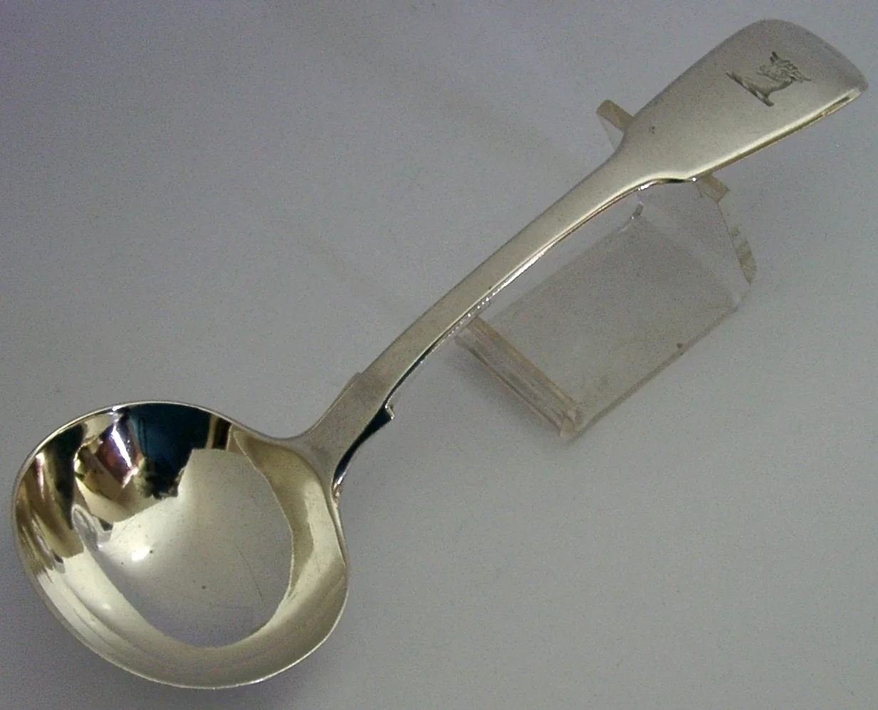 80g STERLING SILVER TURNBULL FAMILY BULL CRESTED SAUCE LADLE 1835 WILLIAM IV