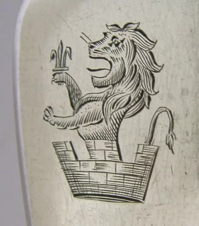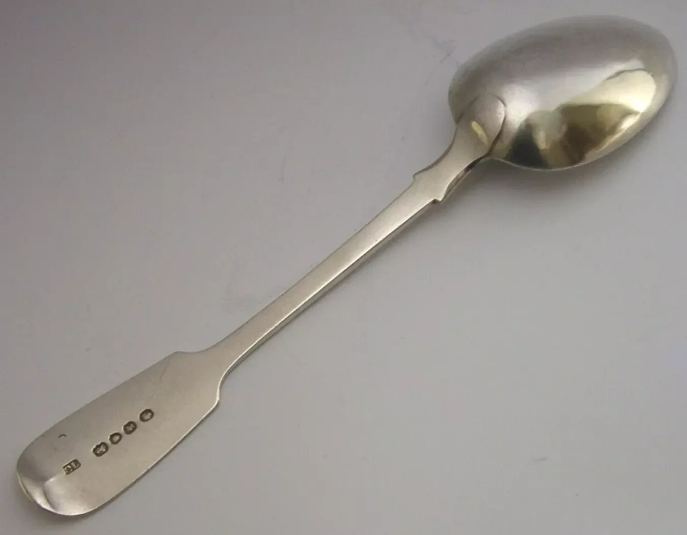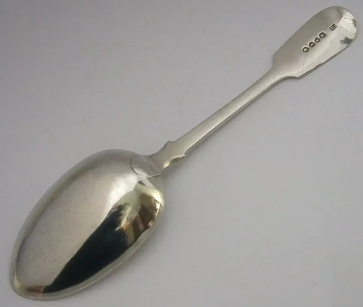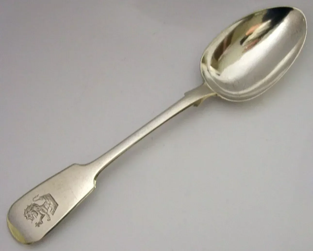 A rare English Victorian solid sterling silver serving spoon. It is hallmarked for London 1846 with the maker being Charles Lias. It has been superbly made and engraved with a lion crest used by the Hayward family once possibly associated with the Gloucestershire area. It is in superb condition being free from dings splits and repairs. It measures approx. 9 inches (22.8cm) long by 2 inches (5cm) wide and weighs 74 grams. A top quality rare piece.
