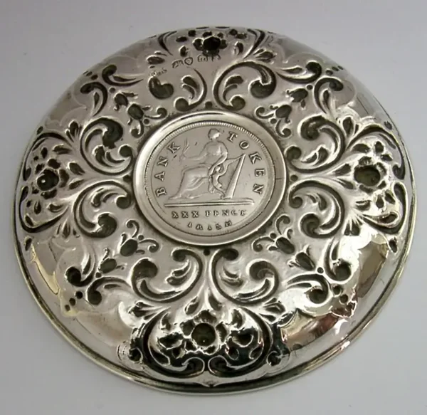 A rare Georgian sterling silver coin dish. It is hallmarked for London 1827 with the makers marks being JK. It has been superbly designed being embossed with scrolls around an 1808 Irish XXX Pence silver Token Coin. It in super condition being free from dings splits holes and repairs. It measures approx. 4 inches (10.2cm) across and weighs 62 grams. A superbly made rare piece.
