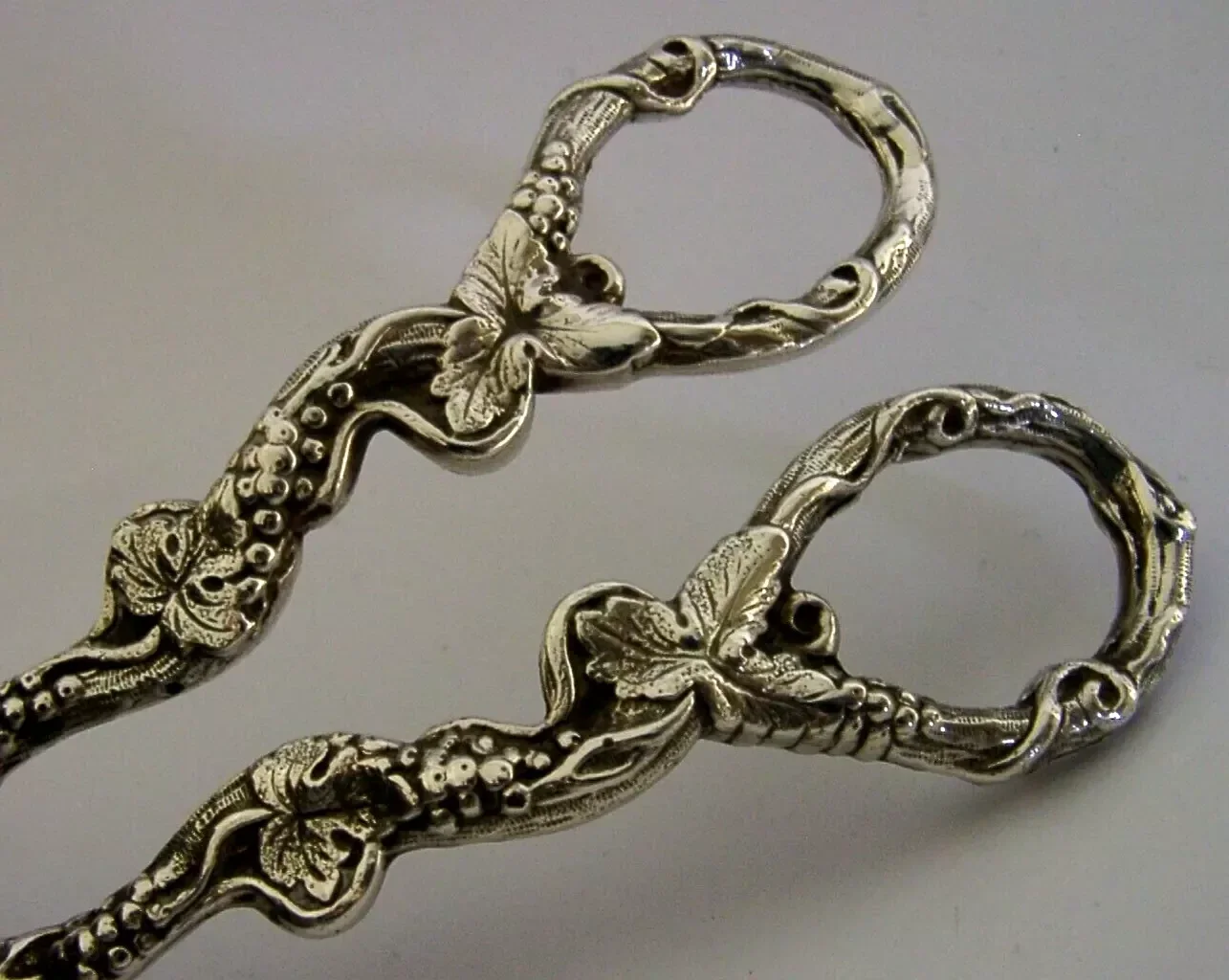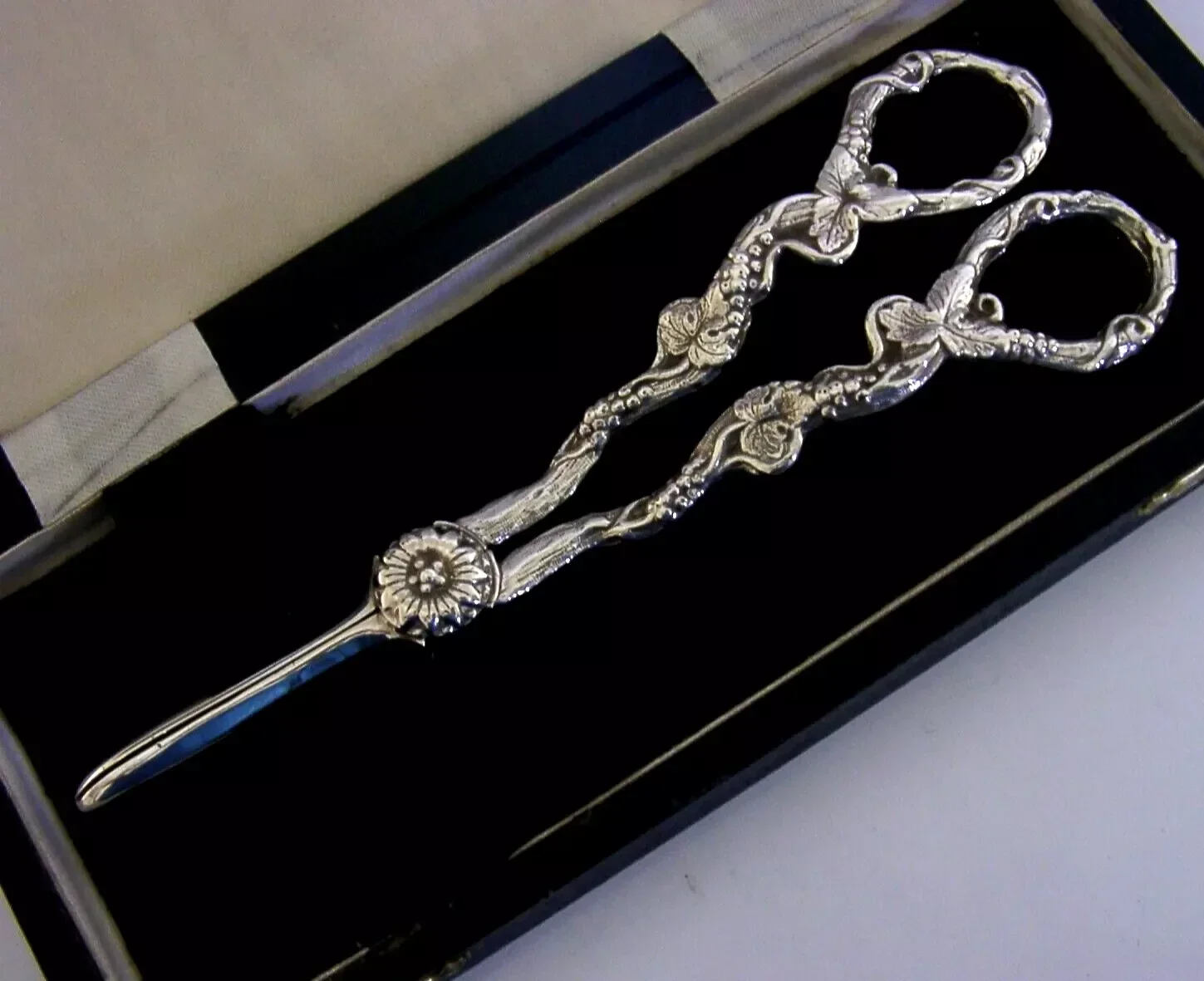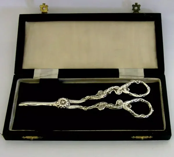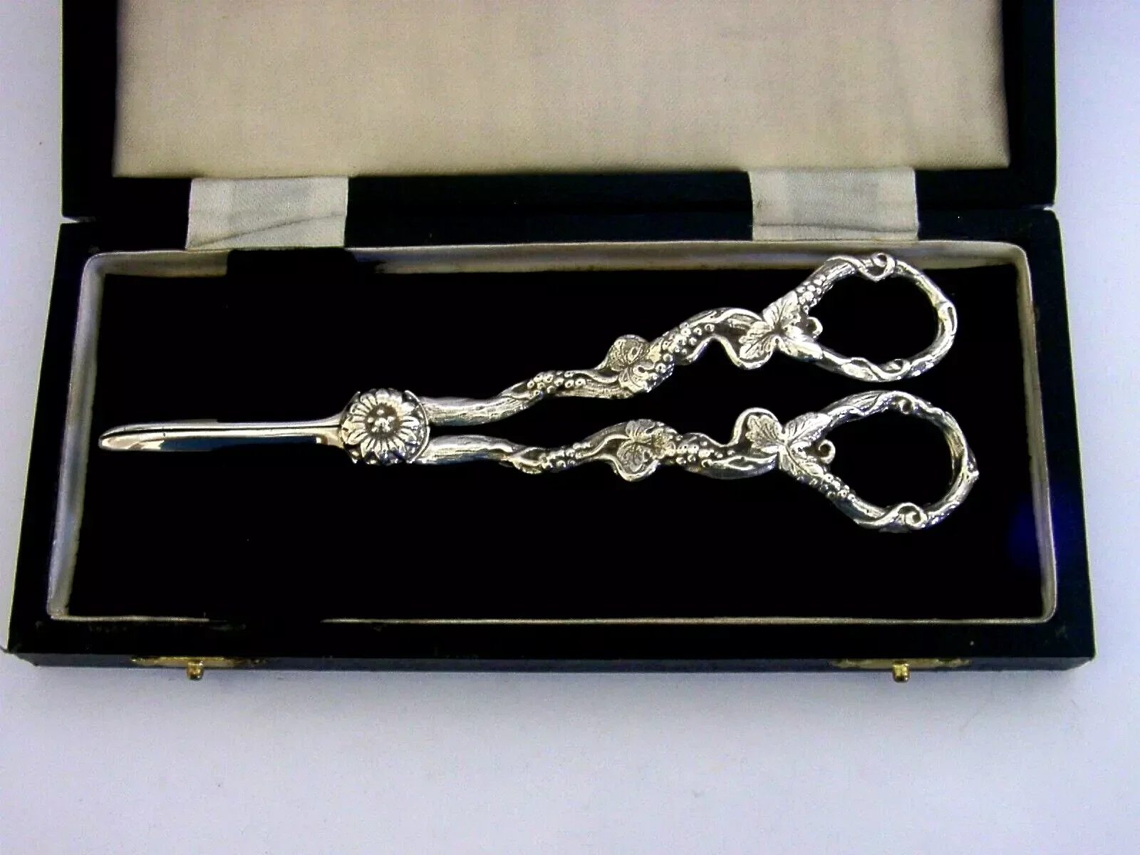 Very high quality mint cased English solid sterling silver grape shears. They are hallmarked for London 1966 Sheffield 2001 with the maker being D J Silver Repairs. They have been superbly made with the handles being cast with grape vines. It is in superb condition being free from dings splits distortions and repairs. They measure approx. 6.5 inches (16.8cm) long by 2.25 inches (5.6cm) wide at the handles and weigh 106 grams excluding the case. Superbly made very high quality examples.