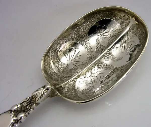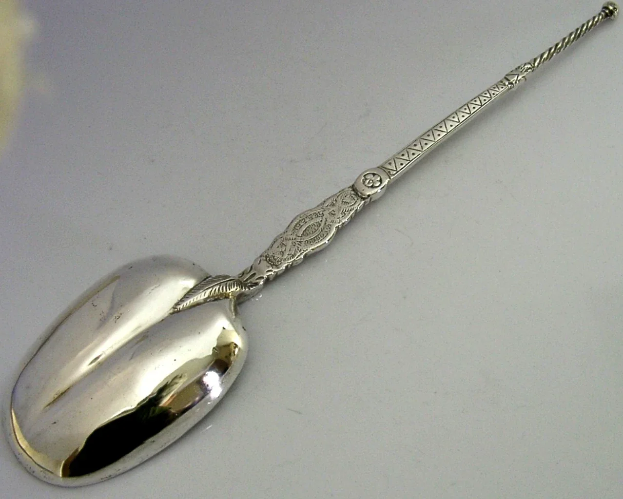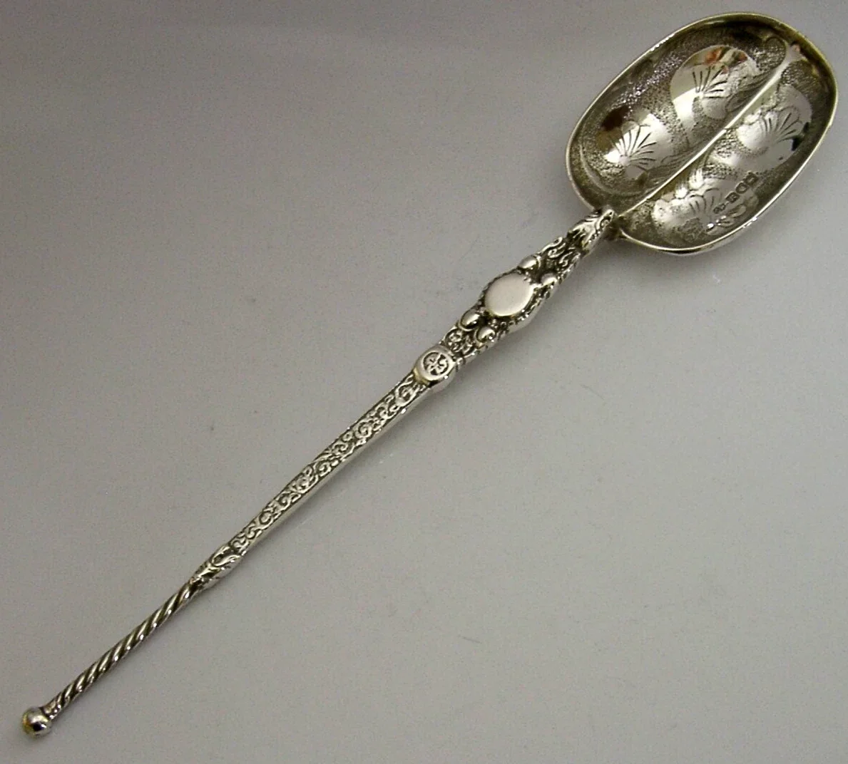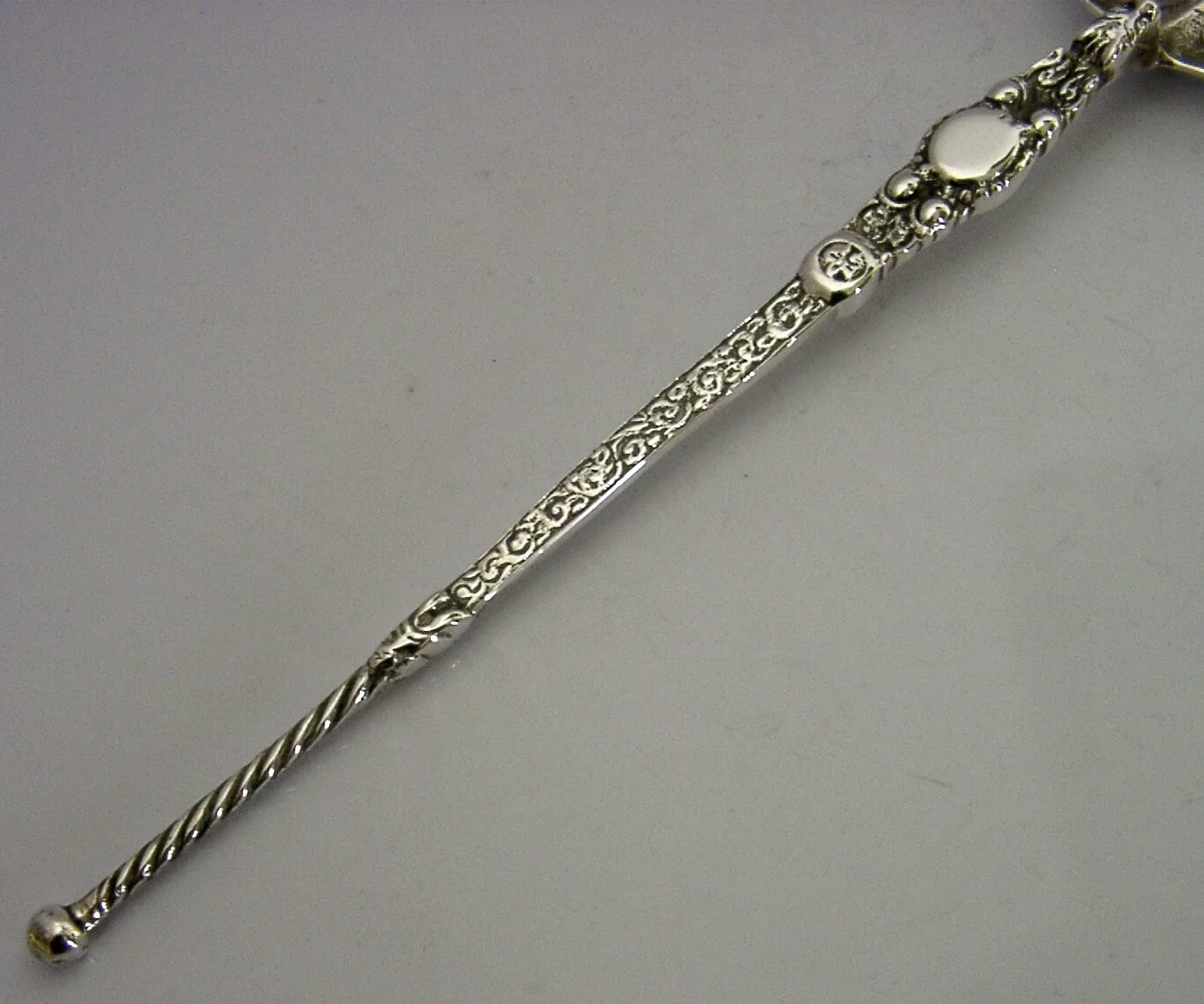 A superb large English antique solid sterling silver spoon. It is hallmarked for London 1902 with the maker being CB. It has been superbly made being a replica of the coronation spoon used to anointed the Kings and Queens of the Great Britain. It is in super condition being free from dings splits holes and repairs. It measures approx. 10.5 inches (26.4cm) long by 2.25 inches wide and weighs 108 grams. A very nice quality unusual piece.