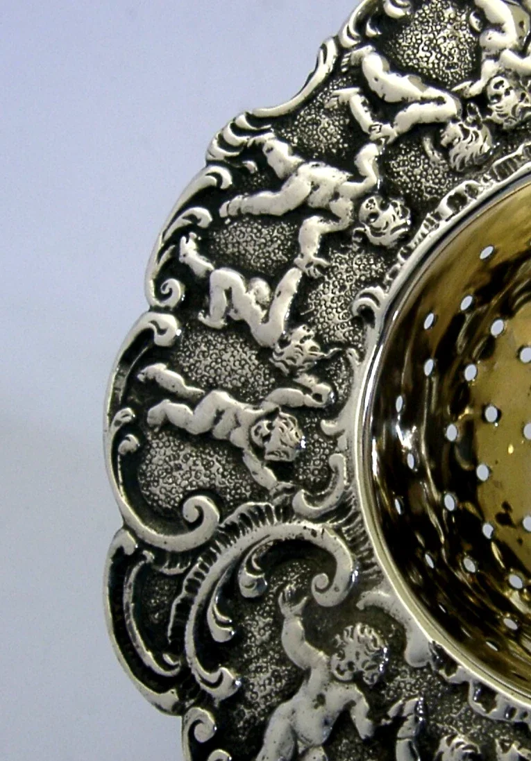 BEAUTIFUL HANAU STERLING SILVER TEA STRAINER CHERUBS c19100-1910 ANTIQUE 58g