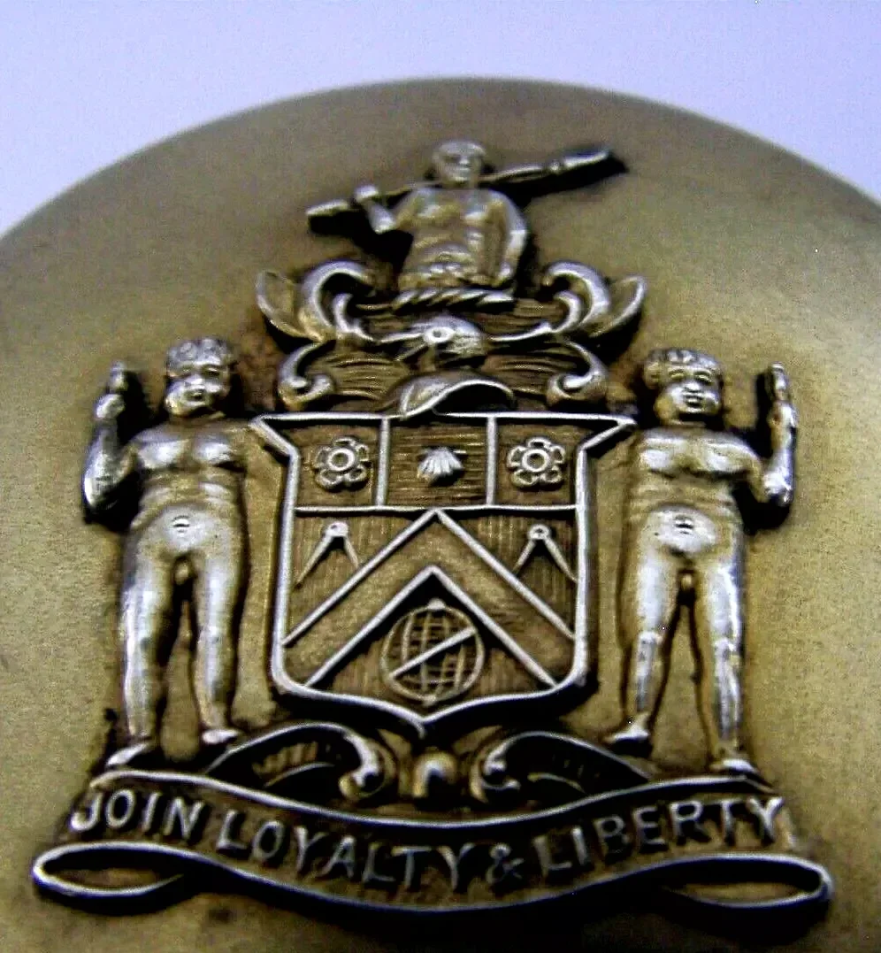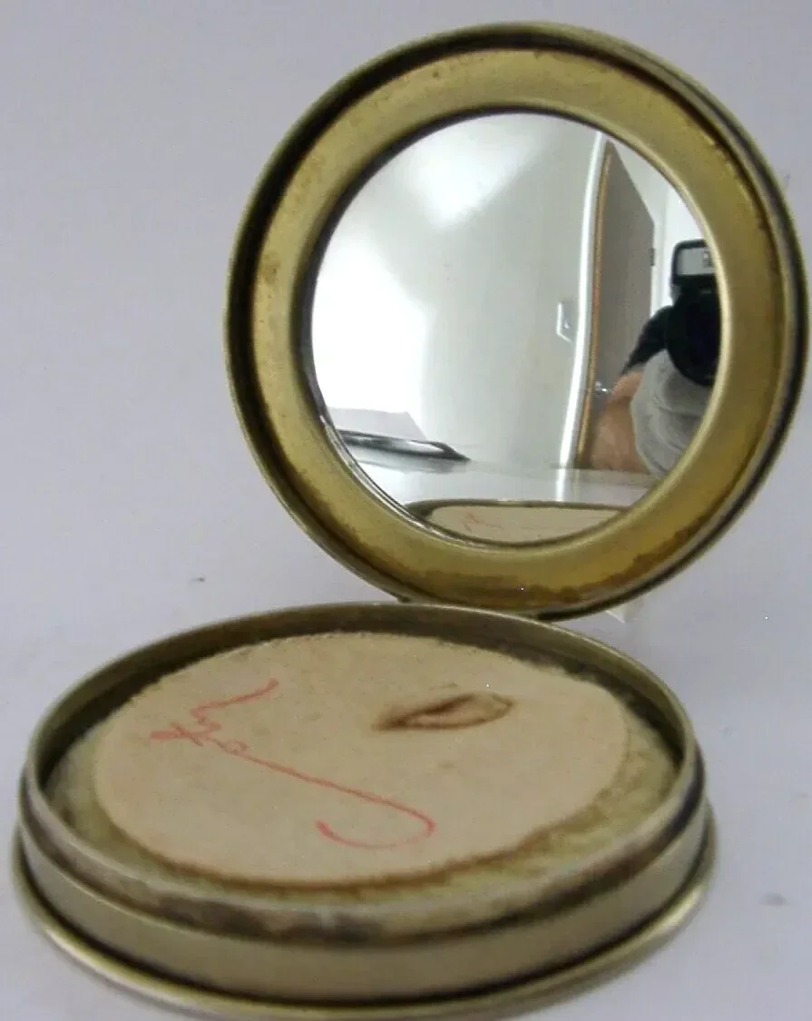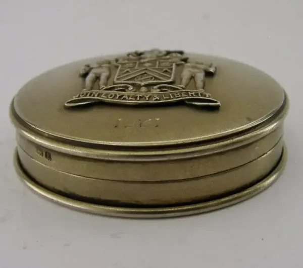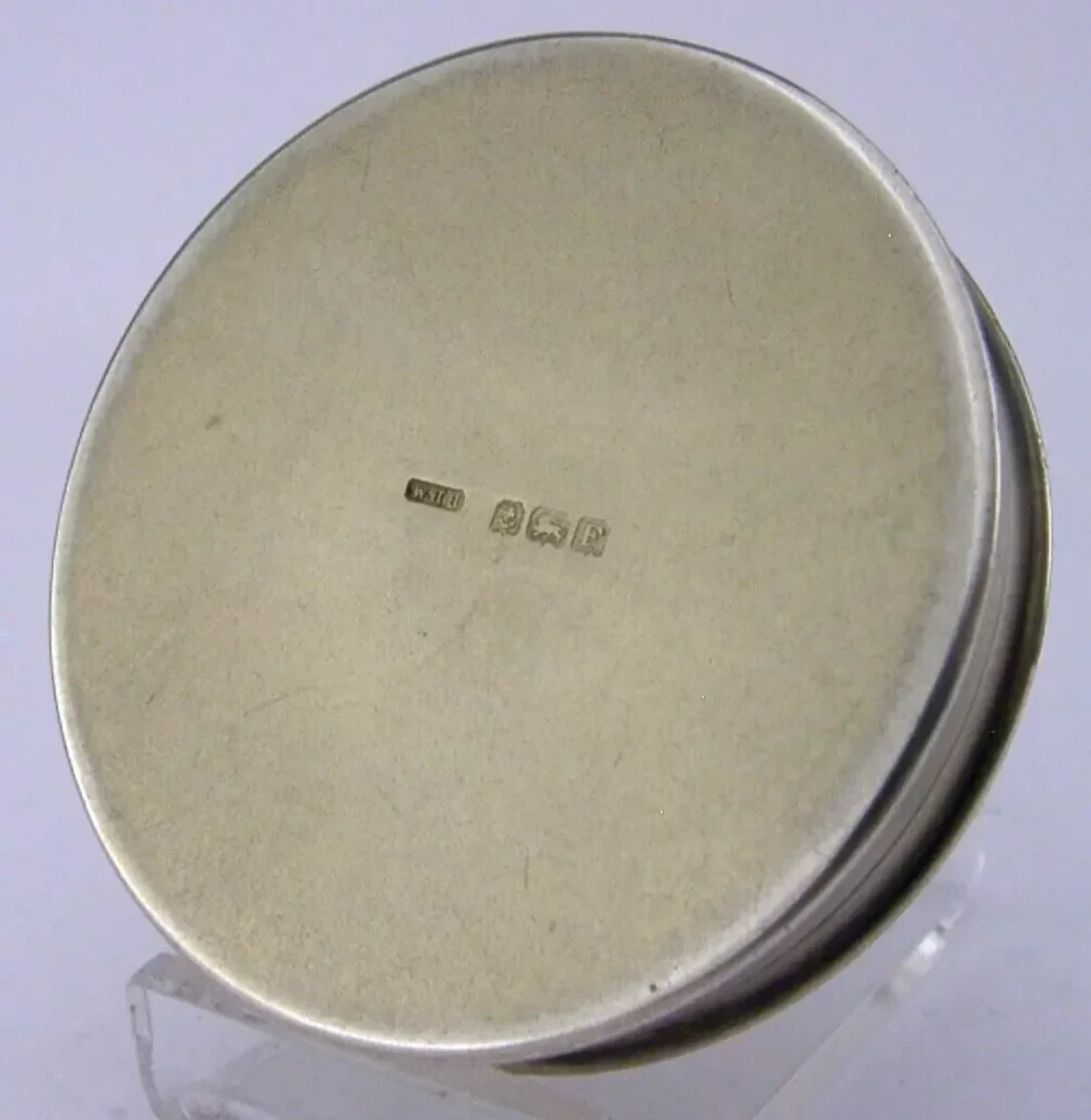 A rare English sterling silver gilt compact. It is hallmarked for Birmingham 1930 with the makers marks being that of W H Haseler Ltd . It has been beautifully designed being gilded with the lid depicting the Worshipful Company of Joiners & Ceilers crest. The inside still retains its original contents and mirror. It is in superb condition being free from dings splits distortions and repairs. It measures approx. 2.25 inches (5.6cm) across by 0.75 inches (2cm) tall and weighs 78 grams. A very well made rare piece.