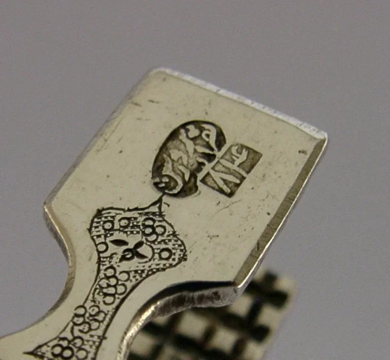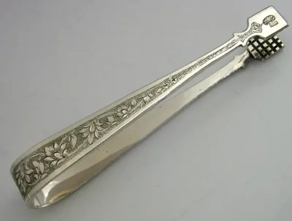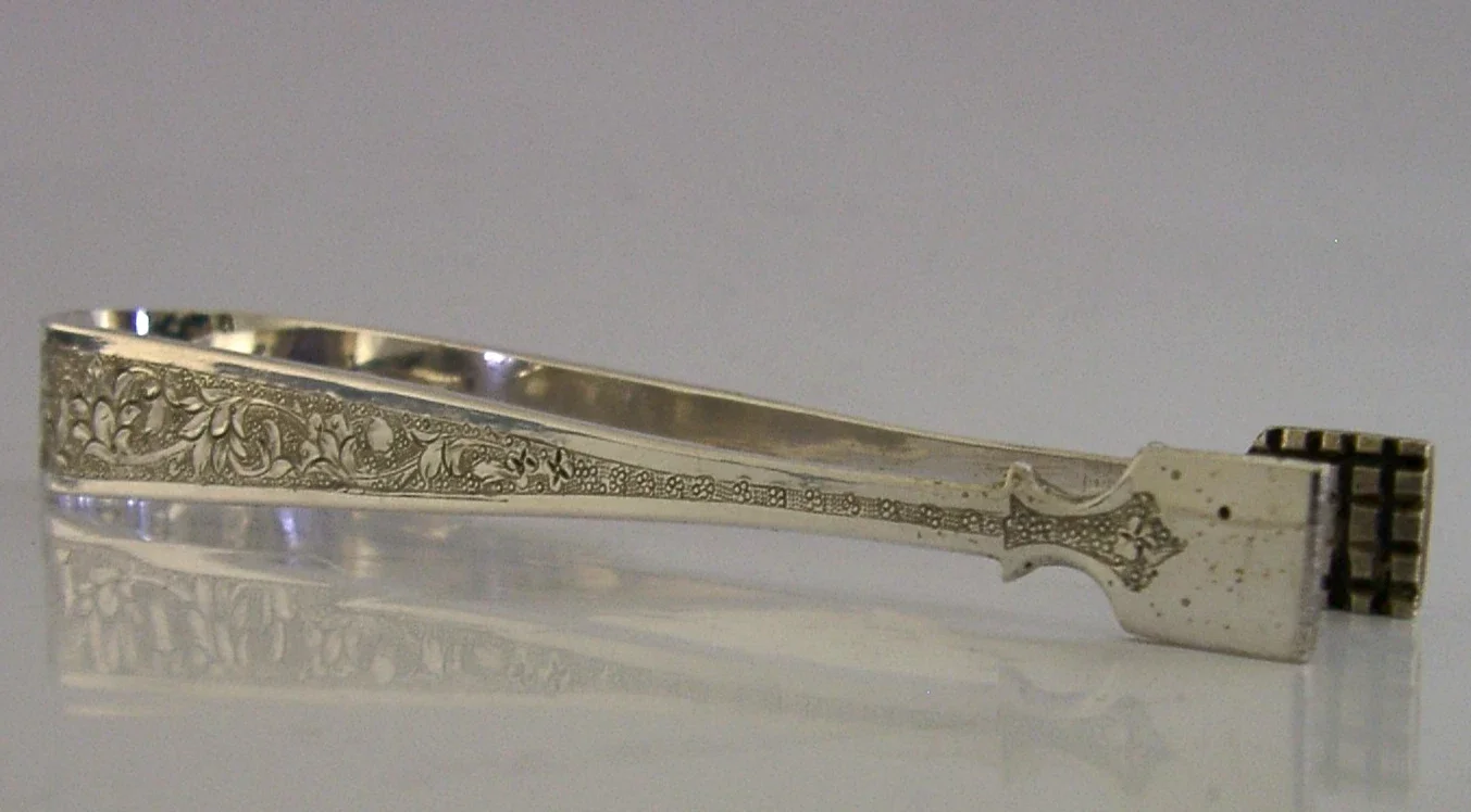 Nicely detailed Persian solid silver sugar tongs. They are hallmarked with the 84 silver standard mark. I would date them to c1940. They have been superbly designed and are in super condition being free from dings splits and repairs. They measure approx. 5 inches (13cm) long and weigh a heavy 60 grams. A very nicely designed more unusual set.