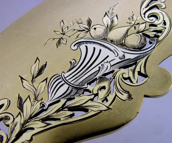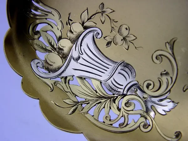A superb set of French antique solid sterling silver servers. They are hallmarked with the Minerva Head 950 silver standard and a makers mark. I would date them to c1900 -1910. They have been beautifully designed being engraved, gilded, and pierced with a vase of flowers and fruit. They are in superb condition being free from dings splits and repairs. The largest piece measures over 10 inches (26.4cm) long the widest piece 3 inches wide combined the weigh 174 grams. A very high quality set.