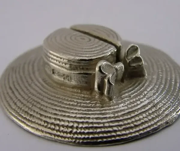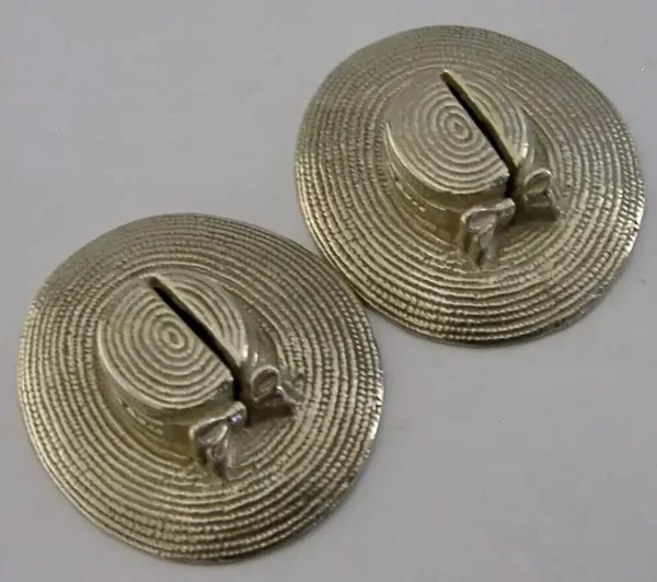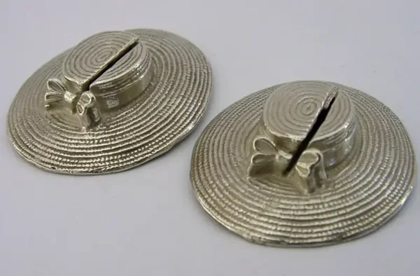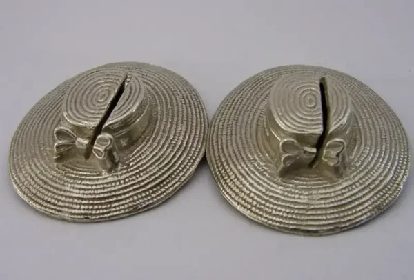 A superbly cast pair of English solid sterling silver novelty menu holders. They are both hallmarked for London 2018 with the makers marks being E&J. They have been superbly designed being cast in the form of a straw hats with bow. They are in superb condition being free from dings splits and repairs. They measures approx. 1.5 inch (4cm) by a touch less (3.5cm) wide and combined weigh 35 grams. A beautiful and unusual pair.