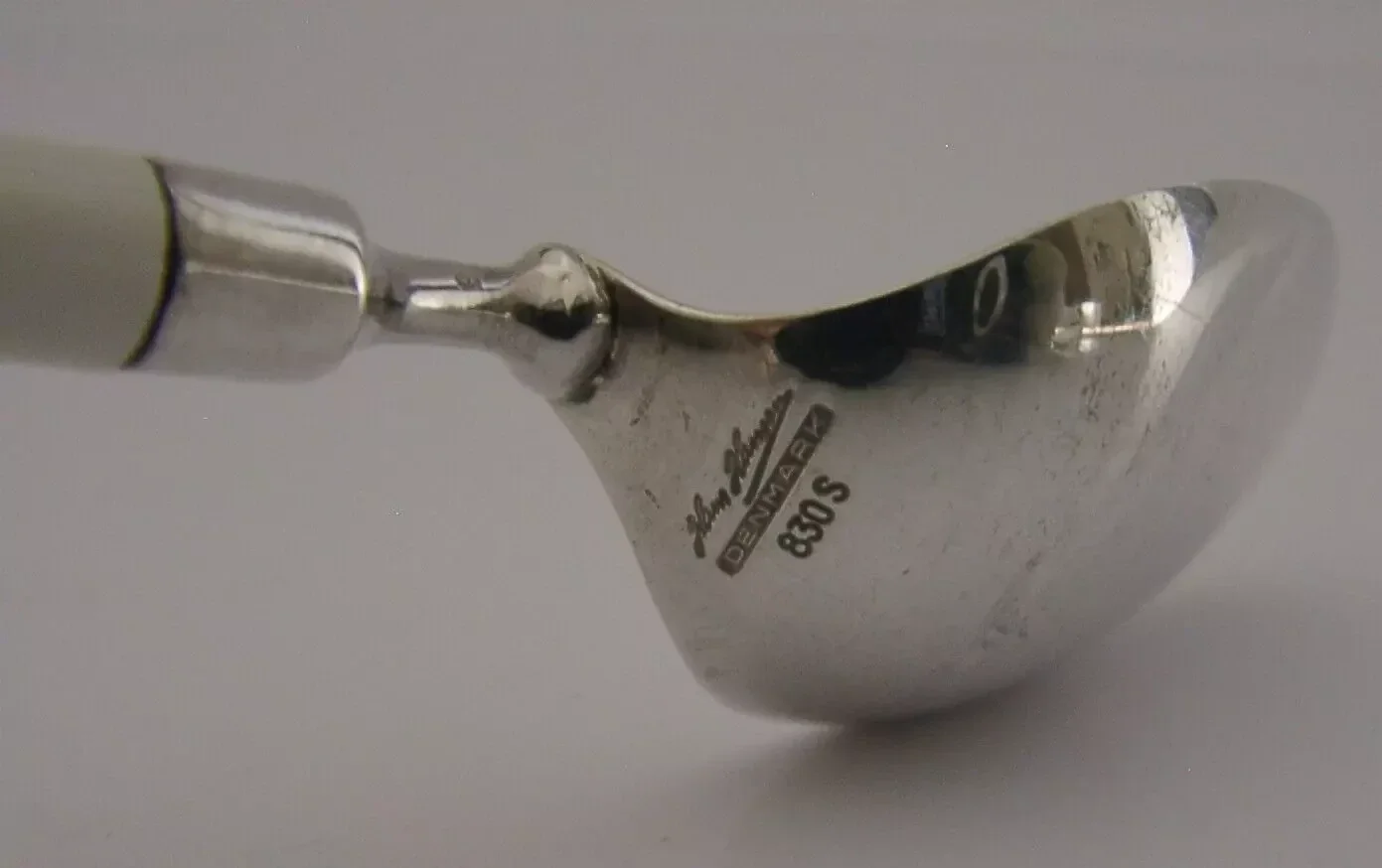 A beautiful set of five Danish solid silver and ceramic ice cream sundae spoons. They are hallmarked with the 830S silver standard mark, DENMARK and the makers mark of the designer Hans Hansen who operated from 1930-1950. They have been superbly designed and are in superb condition being free from dings splits and repairs, tiny chip to the reverse of one handle. They measure approx. 7.5 inches (19cm) long by 1.25 inches (3.1cm) wide and have a combined weight of 138 grams. Beautifully made rare examples.