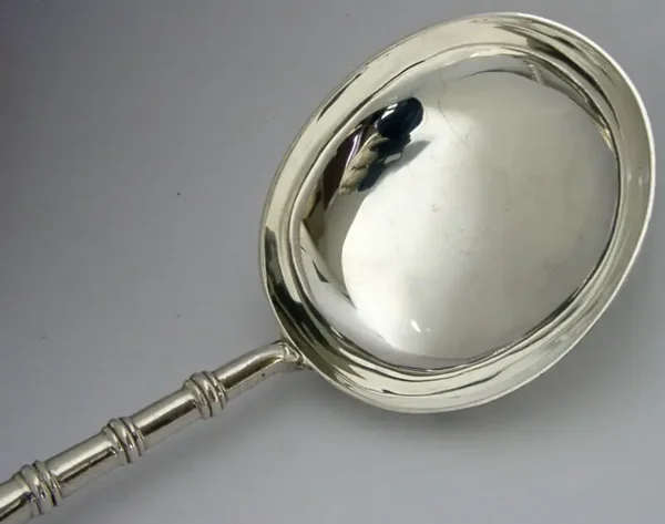 A superb very large English Georgian copy solid sterling silver serving serving ladle. It is hallmarked for London 1967 with the maker being William Comyns & Sons Ltd (Richard Comyns). It has been superbly made to what is termed Canon handled popular during the early 1700's. It is in superb condition being free from dings splits and repairs. It measures approx. 14 inches (35.6cm) long by almost 3.25 inches (8cm) wide and weighs 196 grams. A top quality piece.