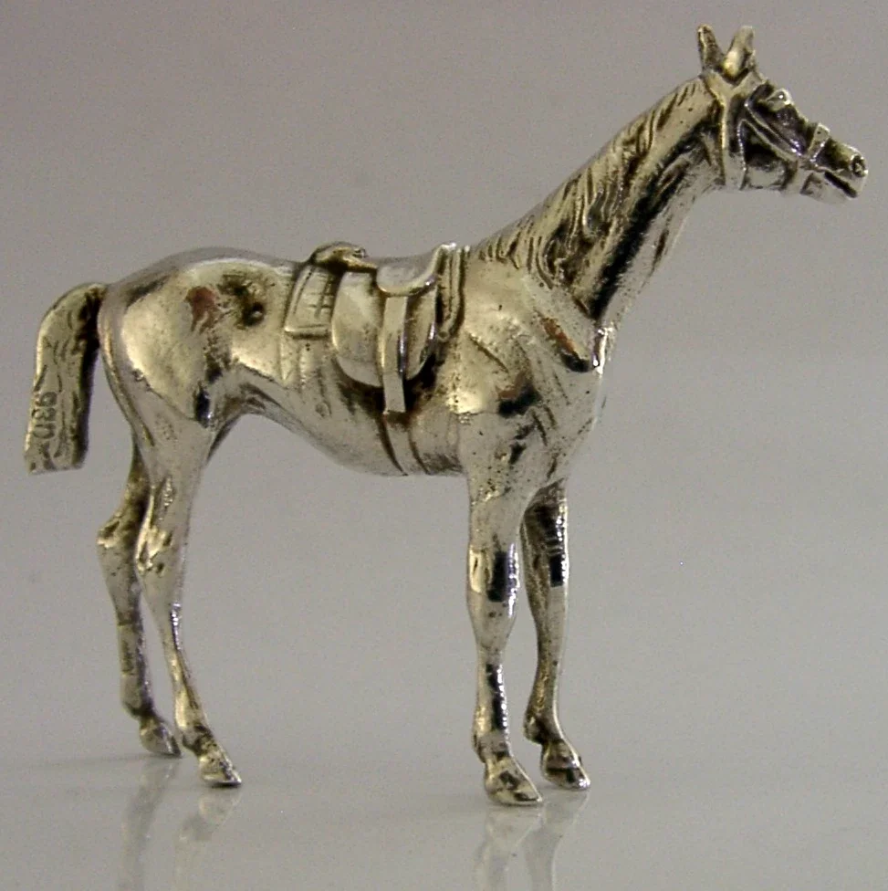 A very nicely detailed rare English import antique solid sterling silver miniature. It is hallmarked with English import marks for London 1903 with the importer being Samuel Boyce (or Boaz) Landeck. It has been superbly modelled in the form of a tacked up horse. It is in perfect condition being free from dings splits and repairs. It measures over 2.25 inches (5.6cm) long by 0.5 inch (1.1cm) wide by 2 inches (5.1cm) tall and weighs 28 grams. A beautiful rare piece.