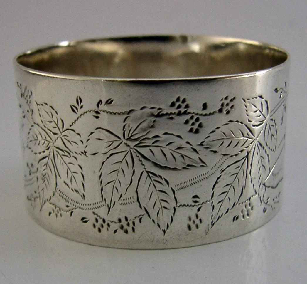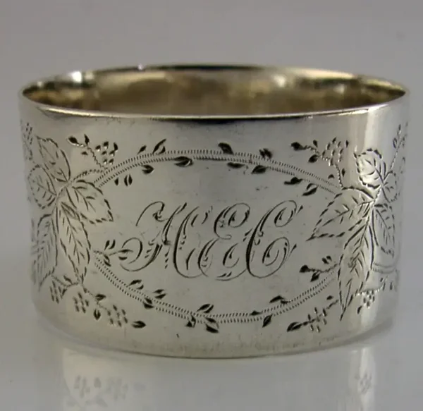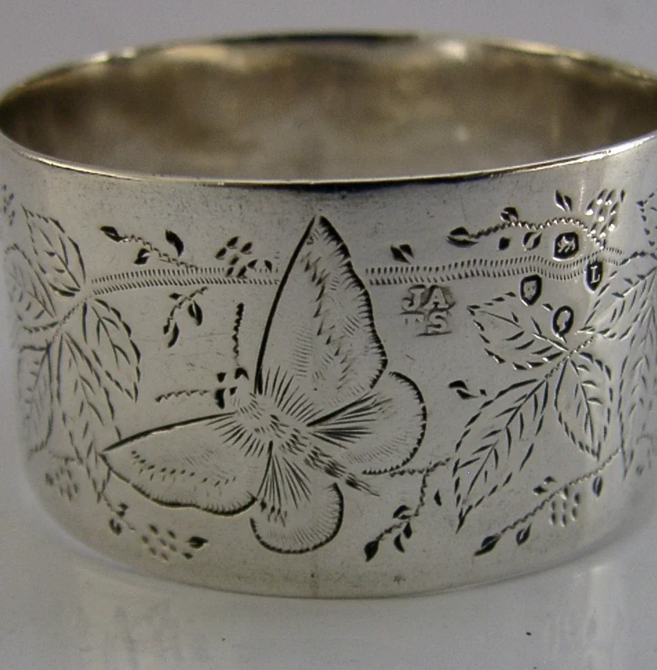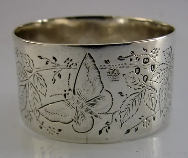 A beautifully engraved Victorian English antique solid sterling silver napkin ring. It is hallmarked for London 1887 with the makers marks being JA over TS. It has been superbly engraved with a butterfly and brambles / blackberries. It also has engraved initials HEC. It is in is in super condition being free from dings splits and repairs. It measures approx. 1.75 inches (4.2cm) wide by 1 inch tall and weighs 19 grams. A very nice piece.