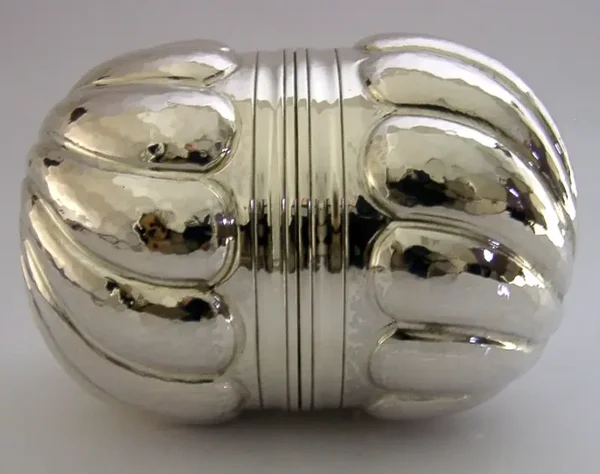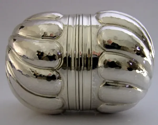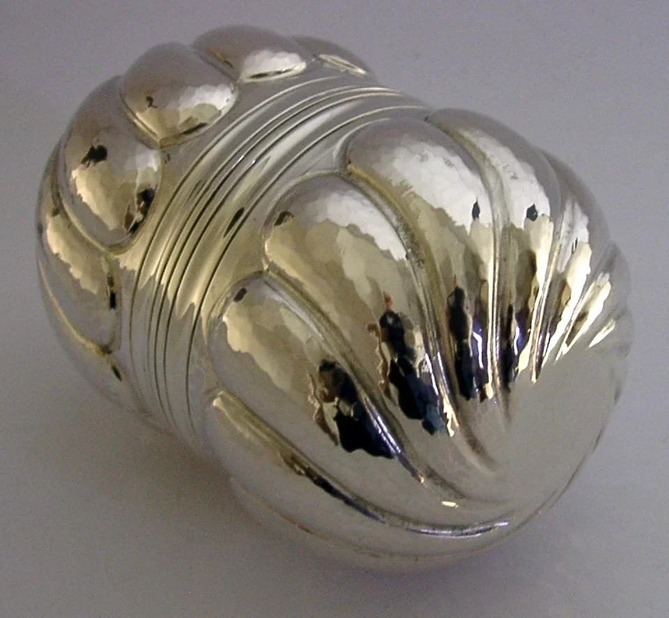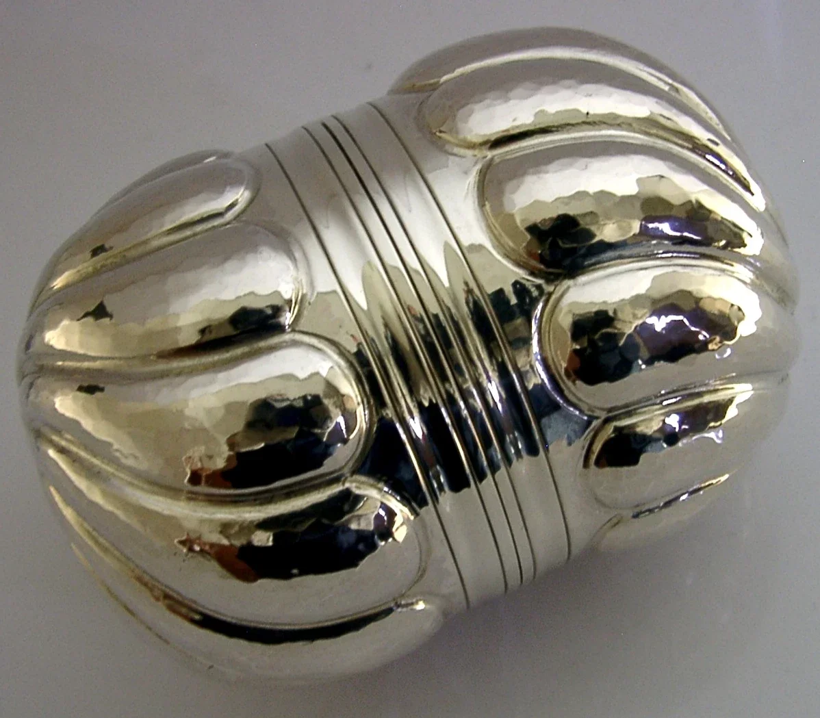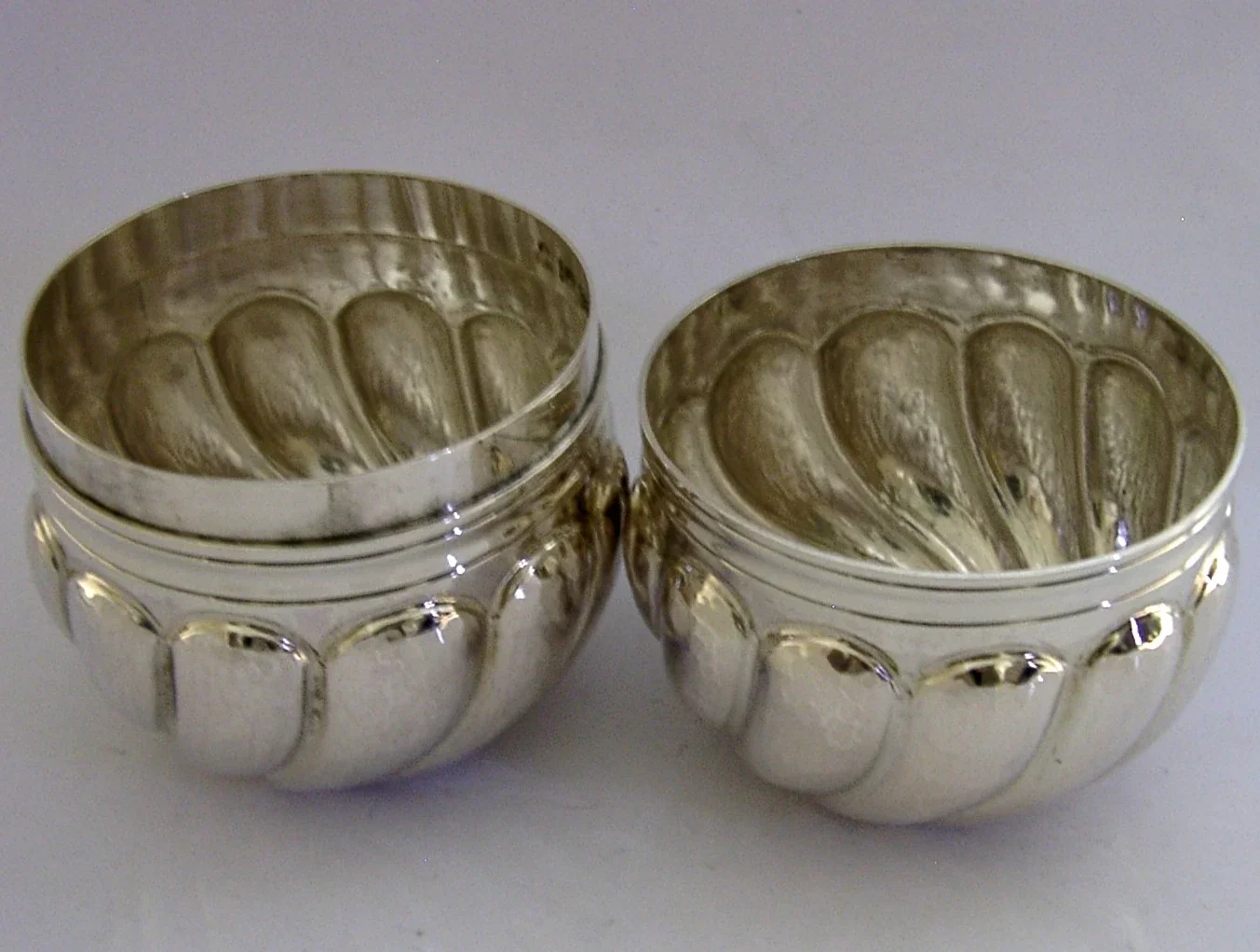 A rare very and unusual beautifully made set of English solid sterling silver conjoined cups. They are hallmarked for London 2003 with the maker being Solomon Joel Phillips, S J Phillips Ltd. They have been beautifully hand plannished and made in the style of 17th century examples. They are in super condition being free from dings splits holes and repairs, the inside is clean and they fit tightly. Together they measures approx. 3.75 inches (9.5cm) long by 2.5 inches (6.4cm) across and weighs 154 grams. A beautiful set.