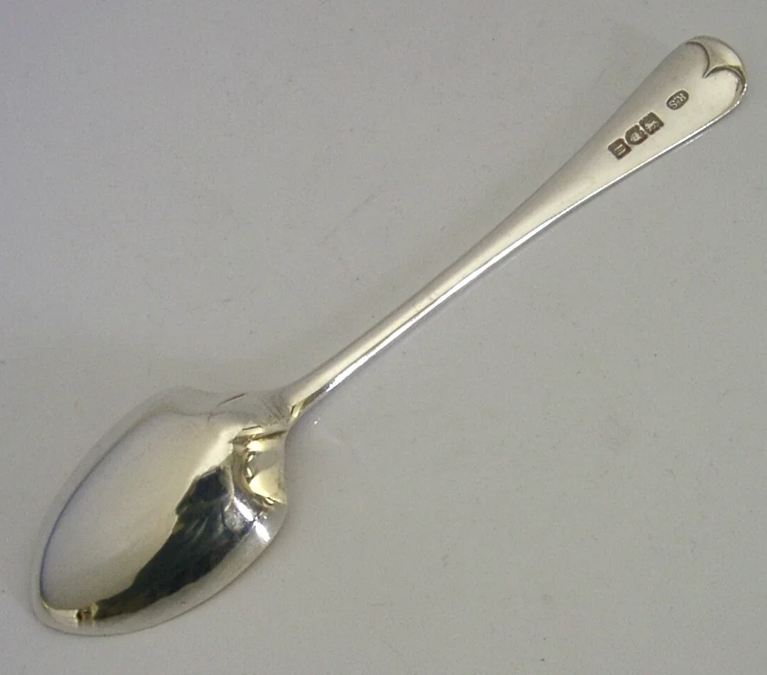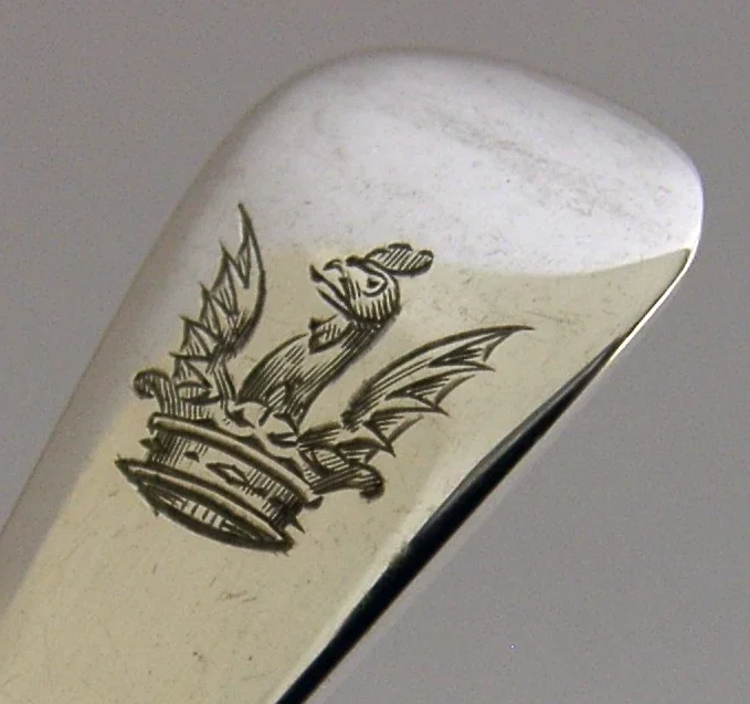 A superb rare English antique solid sterling silver egg spoon. It is hallmarked for London 1908 with the makers mark being RS. It has been superbly made being interestingly engraved with a crest used by the Callis Family. It is in superb condition being free from dings splits distortions and repairs. It measures approx. 5 inches (12.7cm) long and weighs 18 grams. A super quality example.
