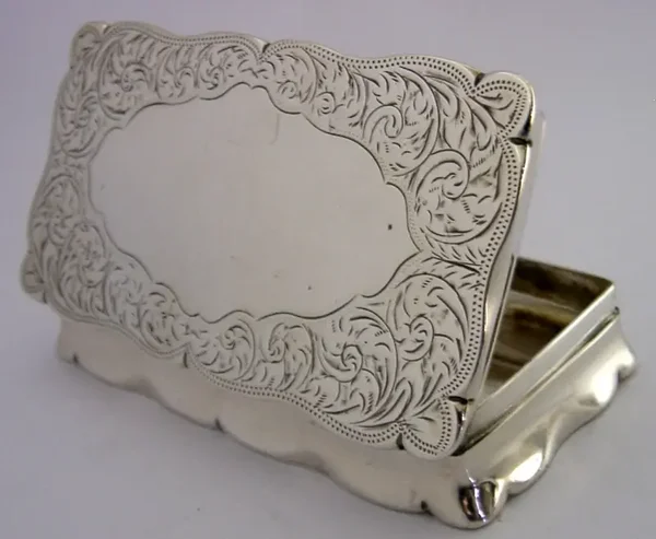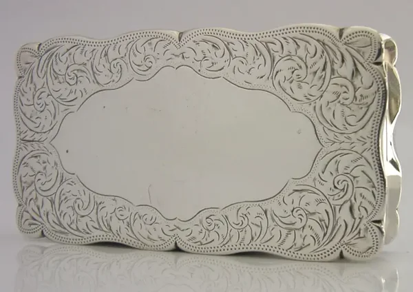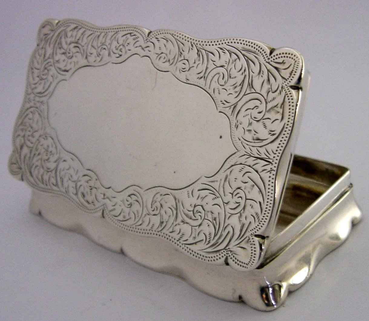 A beautiful large impressive English Edwardian antique solid sterling silver snuff box. It is hallmarked for Birmingham 1902 with the maker being Joseph Gloster Ltd. It has been superbly made being engraved with a scroll design and the cartouche free from any engravings. It is in super condition being free from dings splits holes and repairs. The hinge is smooth and tight, the inside is clean. It measures approx. 3.5 inches (8.8cm) long by over 1.75 inches (4.7cm) wide by 0.75 inch (1.9cm) tall and weighs 102 grams. A high quality example.