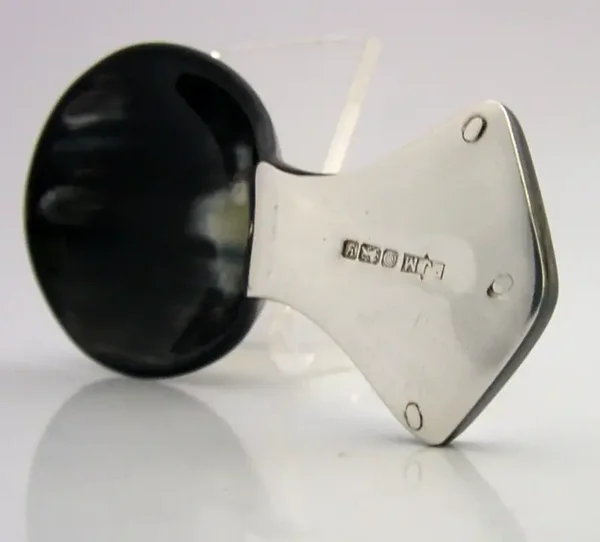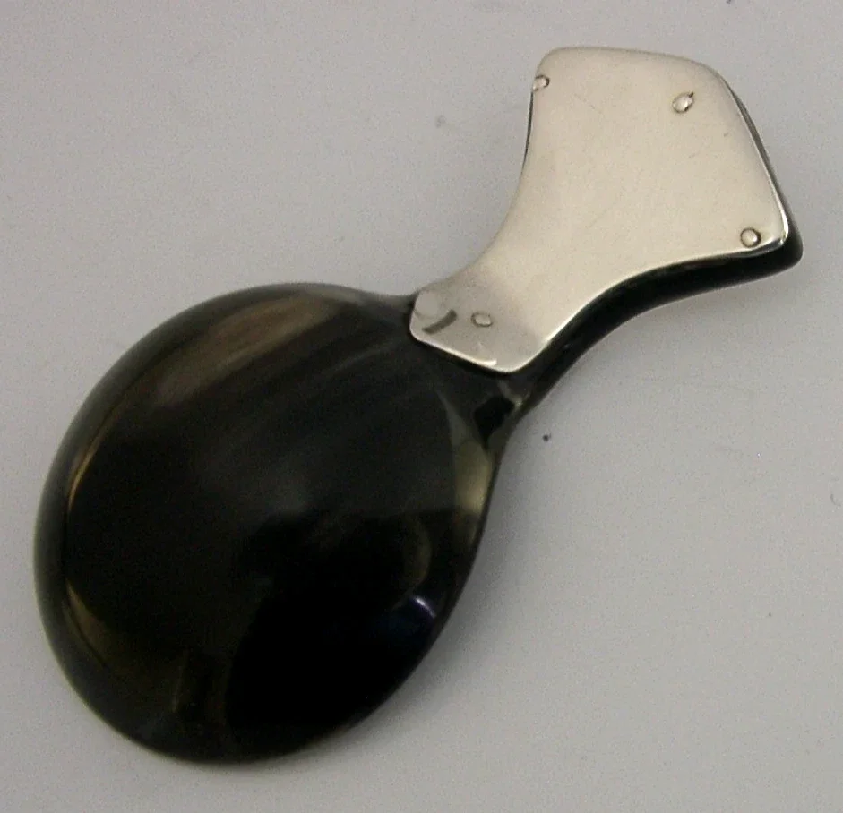 A beautiful hand made English solid sterling silver and horn caddy spoon. It is hallmarked for Sheffield 1998 with the maker being Merriman Silver Ltd (Philippa Jane Merriman). It has been superbly designed being made from horn with the handle being covered in sterling silver. It is in super condition being free from dings splits distortions and repairs. It measures approx. 3.25 inches (8.2cm) long by over 1.5 inches (4.2cm) wide and weighs 16 grams. A very nicely designed piece.
