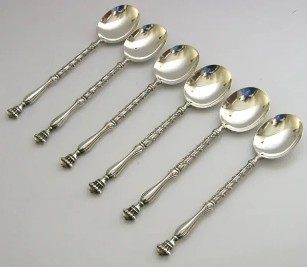 A nicely designed set of six Dutch solid silver spoons. They are hallmarked with the 835 silver standard mark and a makers mark. I would date them to c1930. They are in super condition being free from dings splits distortions and repairs. They measure approx. 4.25 inches (10.6cm) long by over 0.75 inch (2.3cm) wide and have a combined weight of 72 grams. A quality well made set.