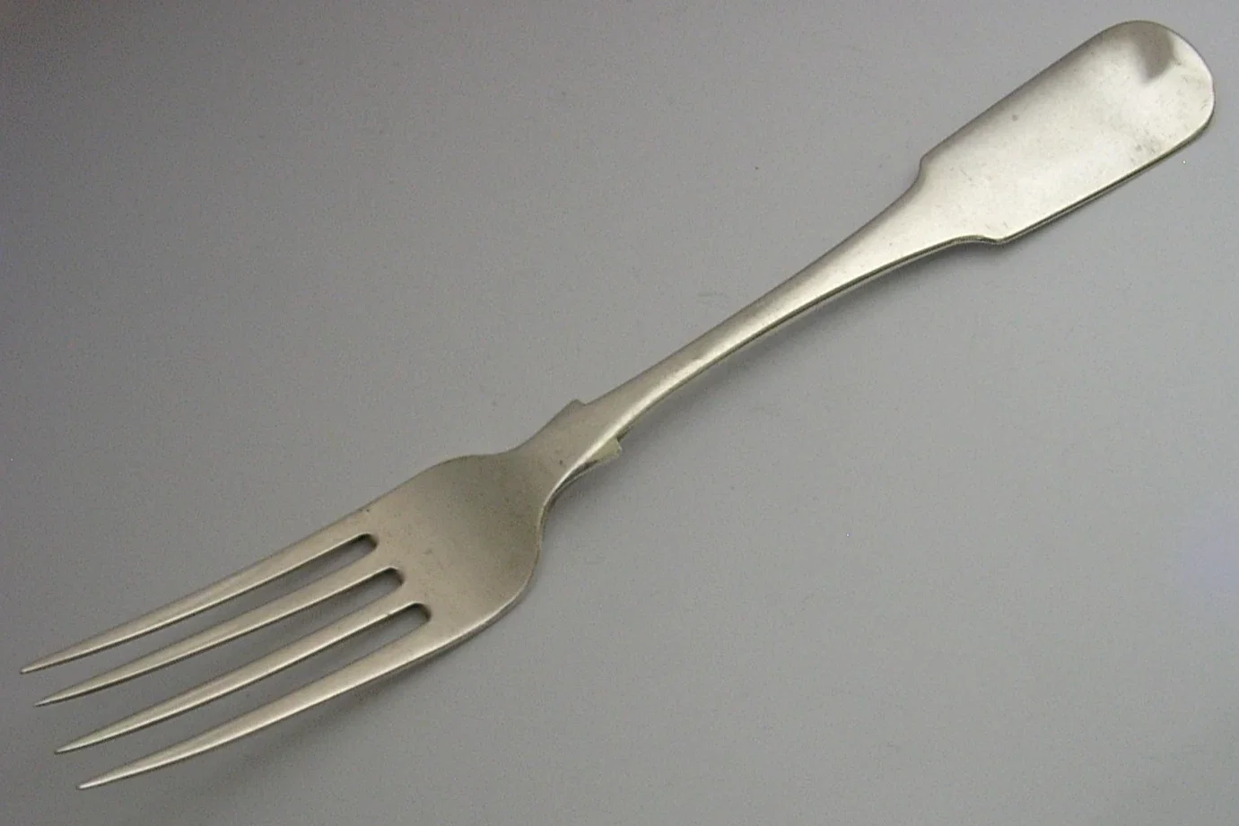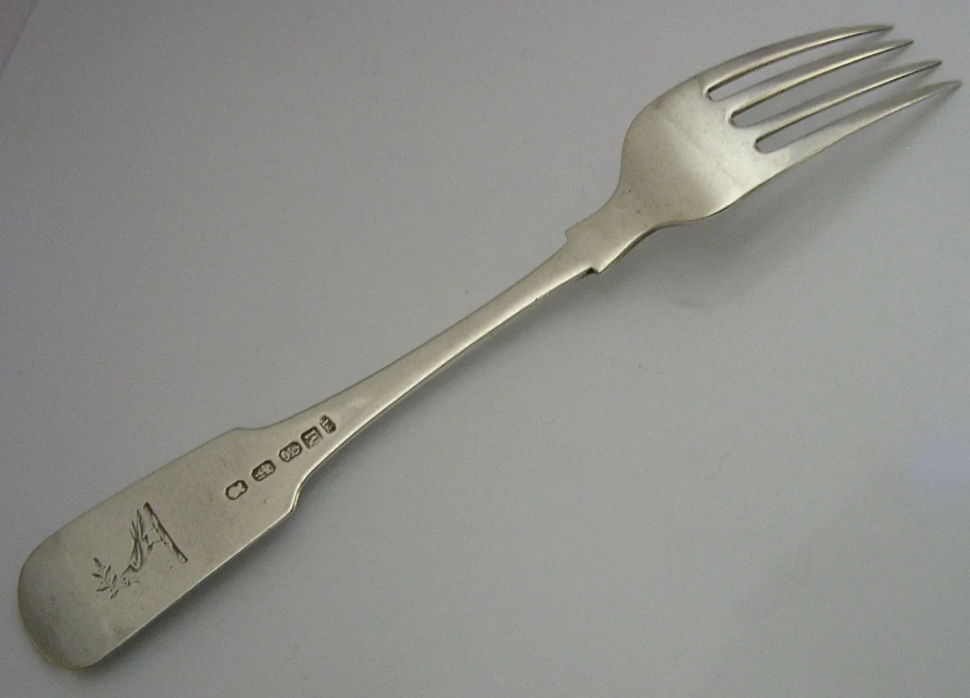 A rare Irish antique solid sterling silver fork. It is hallmarked for Dublin 1808 with the maker being Thomas Farnett. It has been superb designed and has been engraved a dove crest used by the Hodgson family. It is in superb condition being free from dings splits distortions and repairs. It measures approx. 8.25 inches (21.6cm) long by over 1 inch (2.8cm) wide and weighs 60 grams. A super quality interesting piece.