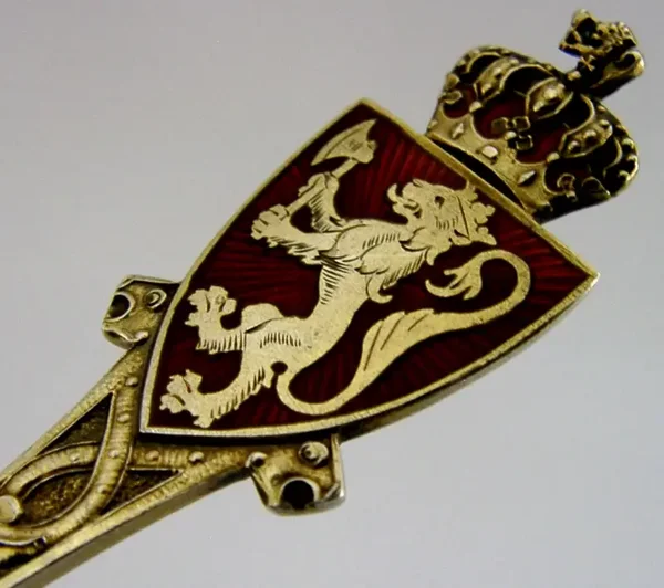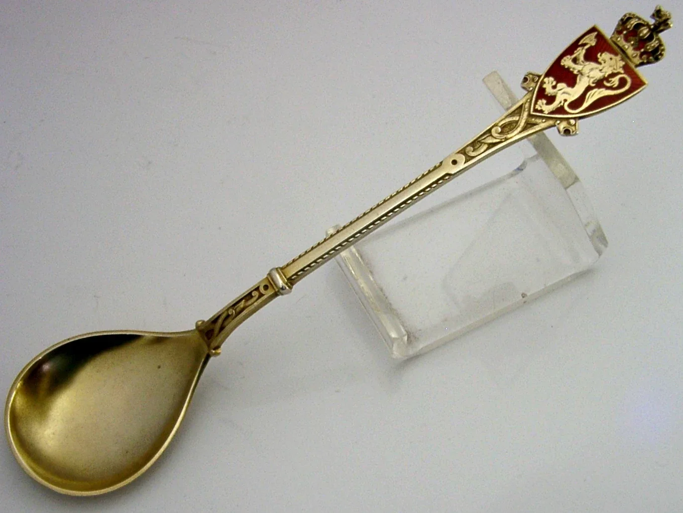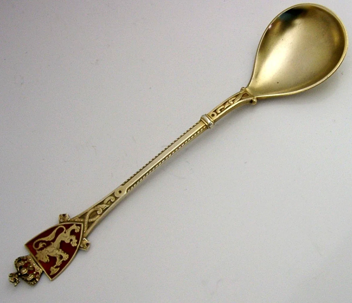 A beautiful Norwegian antique solid sterling silver gilt and enamelled Dragestil spoon. It is hallmarked with 925 sterling silver mark and makers mark of David Andersen. I would date it to c1910. It ha been beautifully made having an enamel terminal in the form of the Norwegian Coat of Arms. It is in super condition being free from dings splits distortions and repairs. It is measures approx. 6 inches (15.2cm) long by 1.25 inches (3.4cm) wide and weighs 22 grams. A very well made piece.