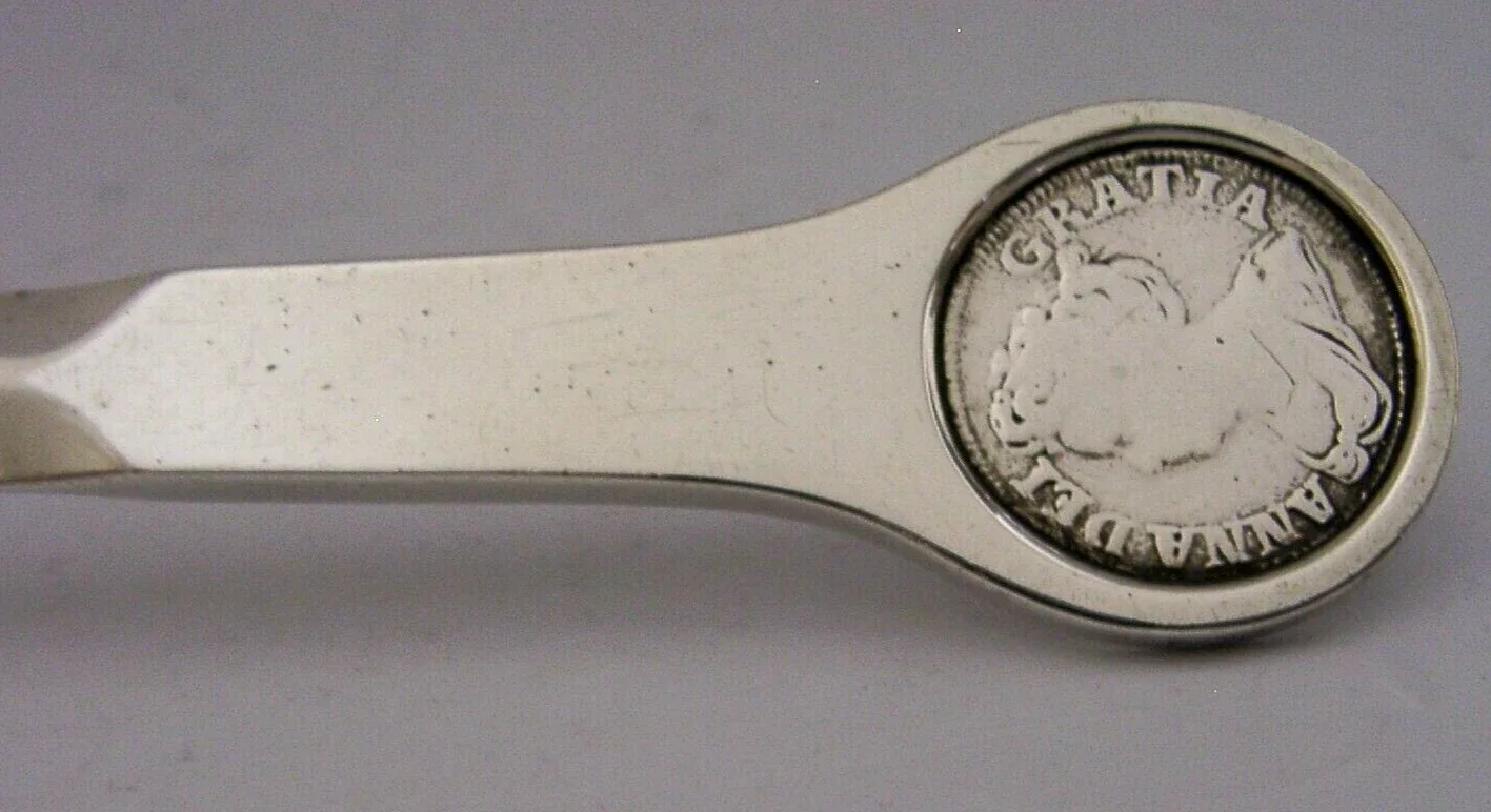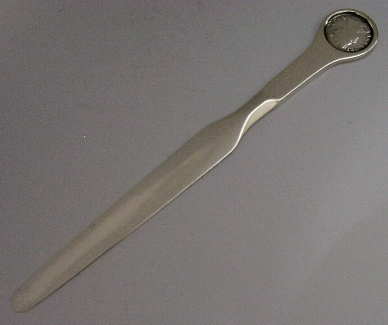 A rare English antique solid sterling silver letter opener. It is hallmarked for London 1813 with the maker being Thomas Wallis (II) & Jonathan Hayne. It has been superbly designed having a 1711 one crown Anna Dei Gratia coin inset to its terminal. It is in super condition being free from dings splits and repairs. It measures approx. 9 inches (22.8cm) long by 1.25 inches (3cm) wide and weighs 64 grams. A nicely designed rare example.