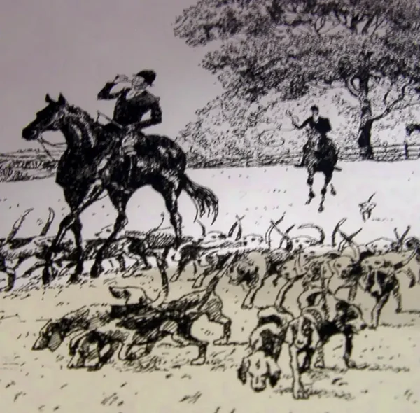 182g ENGLISH STERLING SILVER DISH TRAY RIDING TO THE HUNT 1973 CASED FOX HUNTING