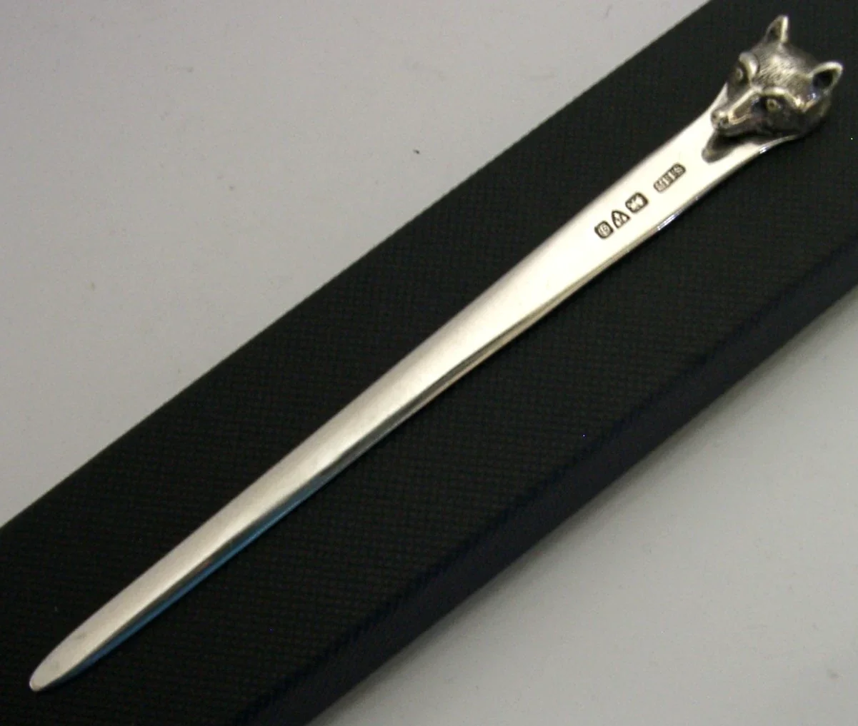 FOX ENGLISH CHESTER STERLING SILVER LETTER ENVELOPE OPENER 1903 HUNTING ANTIQUE