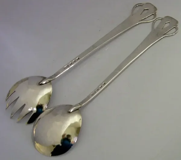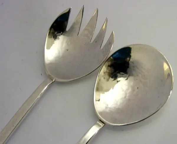 Rare beautiful Arts and Crafts set of solid sterling silver salad servers. They are hallmarked for London 1936 with the maker being the Rev. Charles Godfrey Langdon. They have been beautifully designed being plannished and are in superb condition being free from dings splits distortions and repairs. They measure over 8.5 inches (22cm) long by over 1.75 inches (4.8cm) wide and have a combined weight of 114 grams. A well-made well designed set.