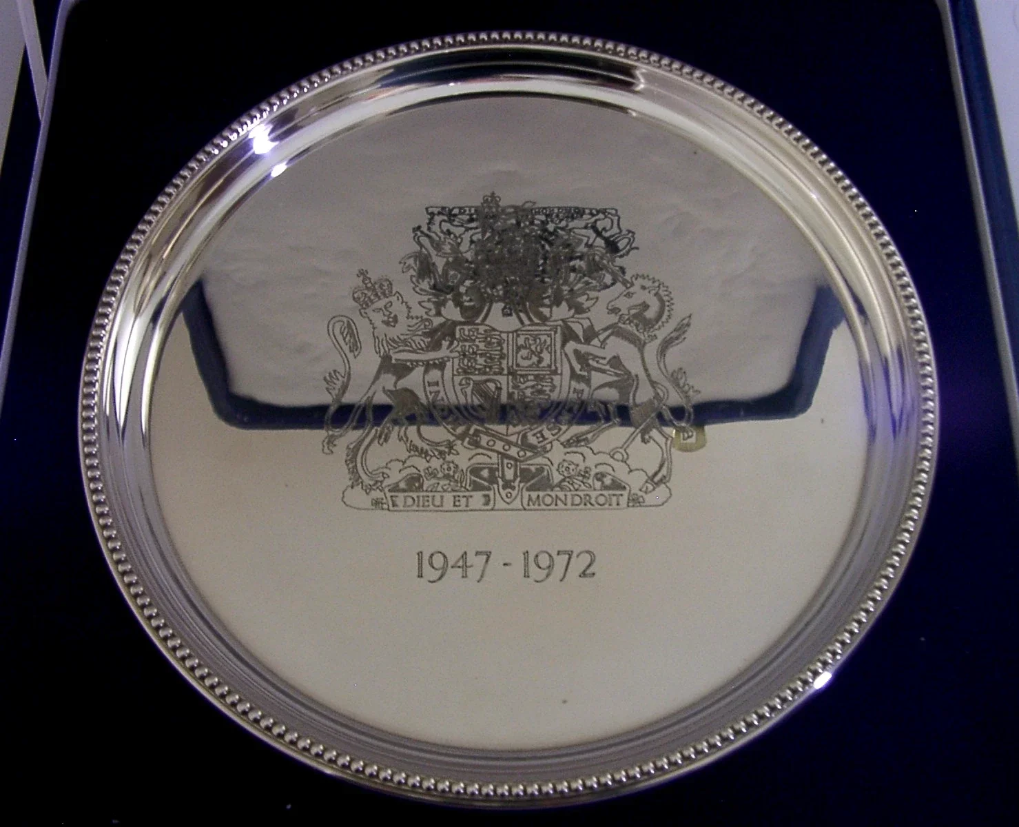 A superb cased English solid sterling silver commemorative tray. It is hallmarked for Birmingham 1972 with the maker being Historical Heirlooms Ltd. It has been superbly designed to mark the Silver wedding anniversary of Queen Elizabeth II and Prince Philip. It is a limited edition this being number 1752 of 3500. It is in outstanding condition being free from dings splits distortions and repairs. The odd mark to the case but nothing serious. The tray measures approx. 8 inches (20.2cm) across and weighs 302 grams excluding the case. A very good quality well made piece.