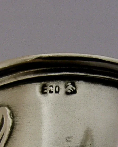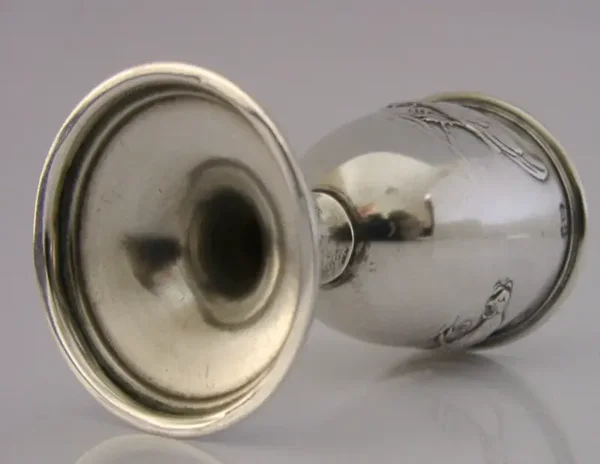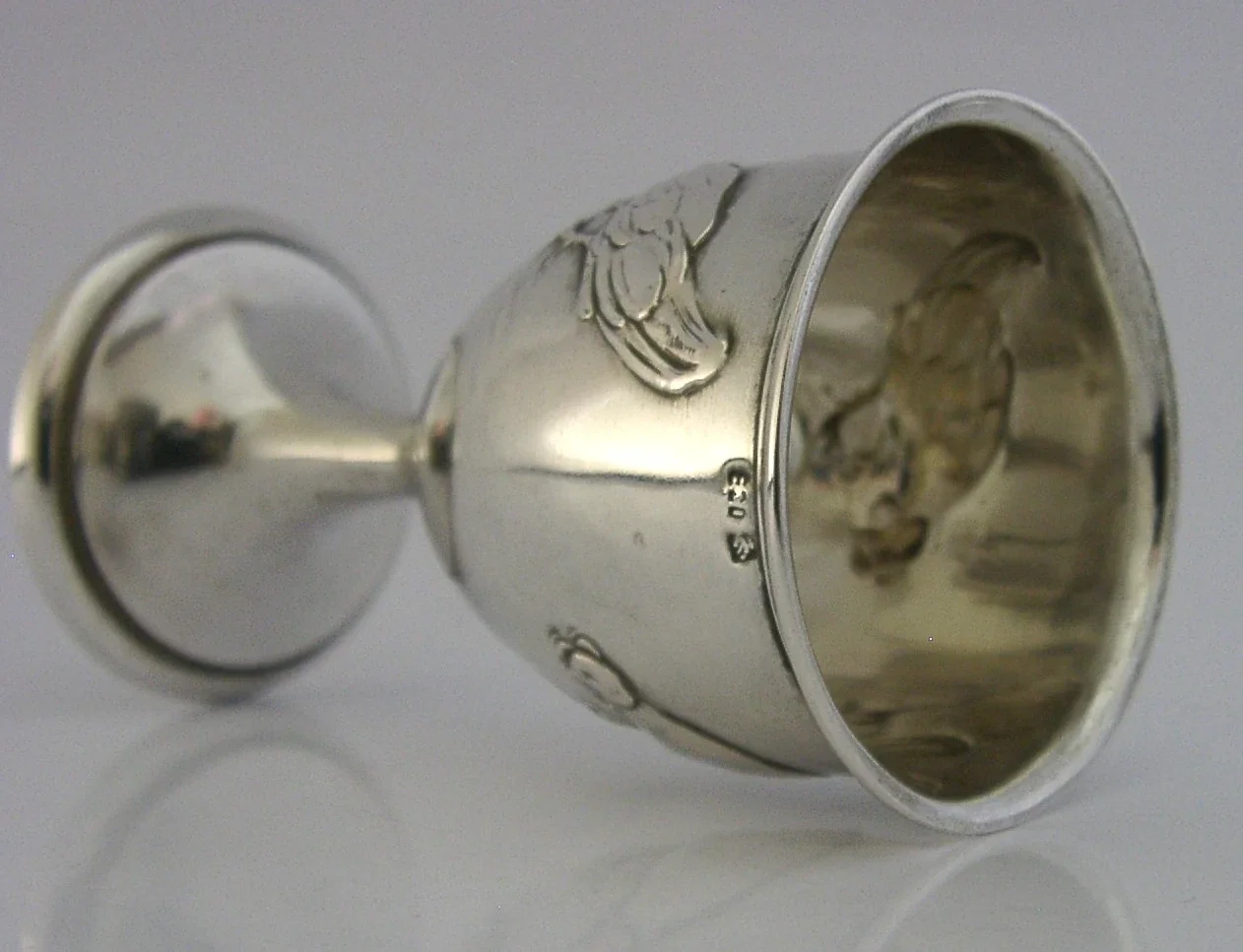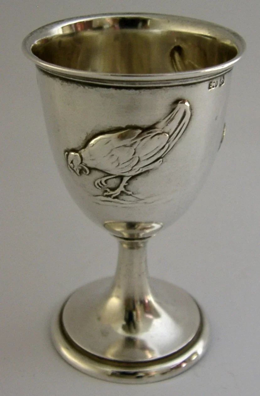 A beautiful Continental solid silver gilt egg cup. It is hallmarked possibly with the 800 standard mark partially struck, (it tests as 800 grade silver), along with a makers mark. I would ate it to c1940s. It has been beautifully designed being embossed with the image of chickens. It is in superb condition being free from dings splits and repairs. It measures approx. 2.75 inches (7cm) tall by 1.75 inches (4.4cm) across the rim and weighs 20 grams. A very nice clean useable piece.