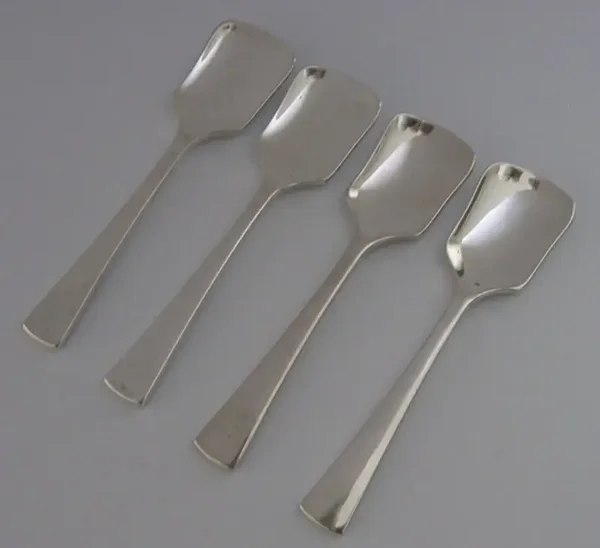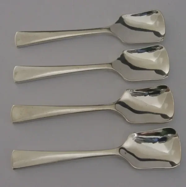 A superb set of four solid silver ice cream spades. They are hallmarked with the 800 standard mark along with a makers mark, I would date them to c1940-1950. They have been well made and are in superb condition being free from dings splits and repairs. They measure approx. 4 inches (9.5cm) long by almost 1 inch (2.5cm) wide and weighs 90 grams. A very nicely designed examples.