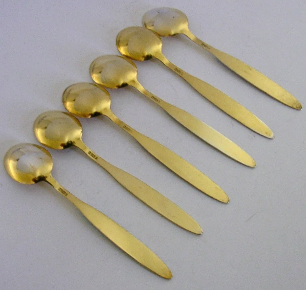 A beautiful nice clean set of Norwegian sterling silver gilt and enamel coffee spoons. They are hallmarked with the 925S silver standard mark and the makers mark of Tostrup of Oslo. They are in super condition being free from dings splits and repairs. The enamel is perfect. Slight gilding wear to the bowl backs. They measure 4.25 inches (10.3cms) long and combined weigh 70 grams. A very nicely designed set.