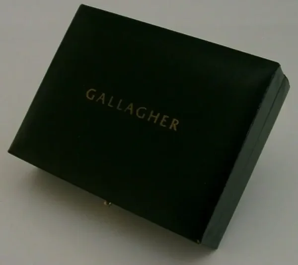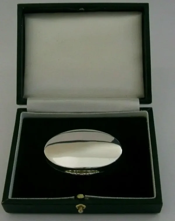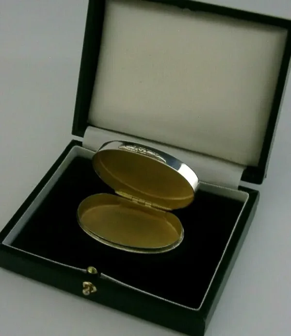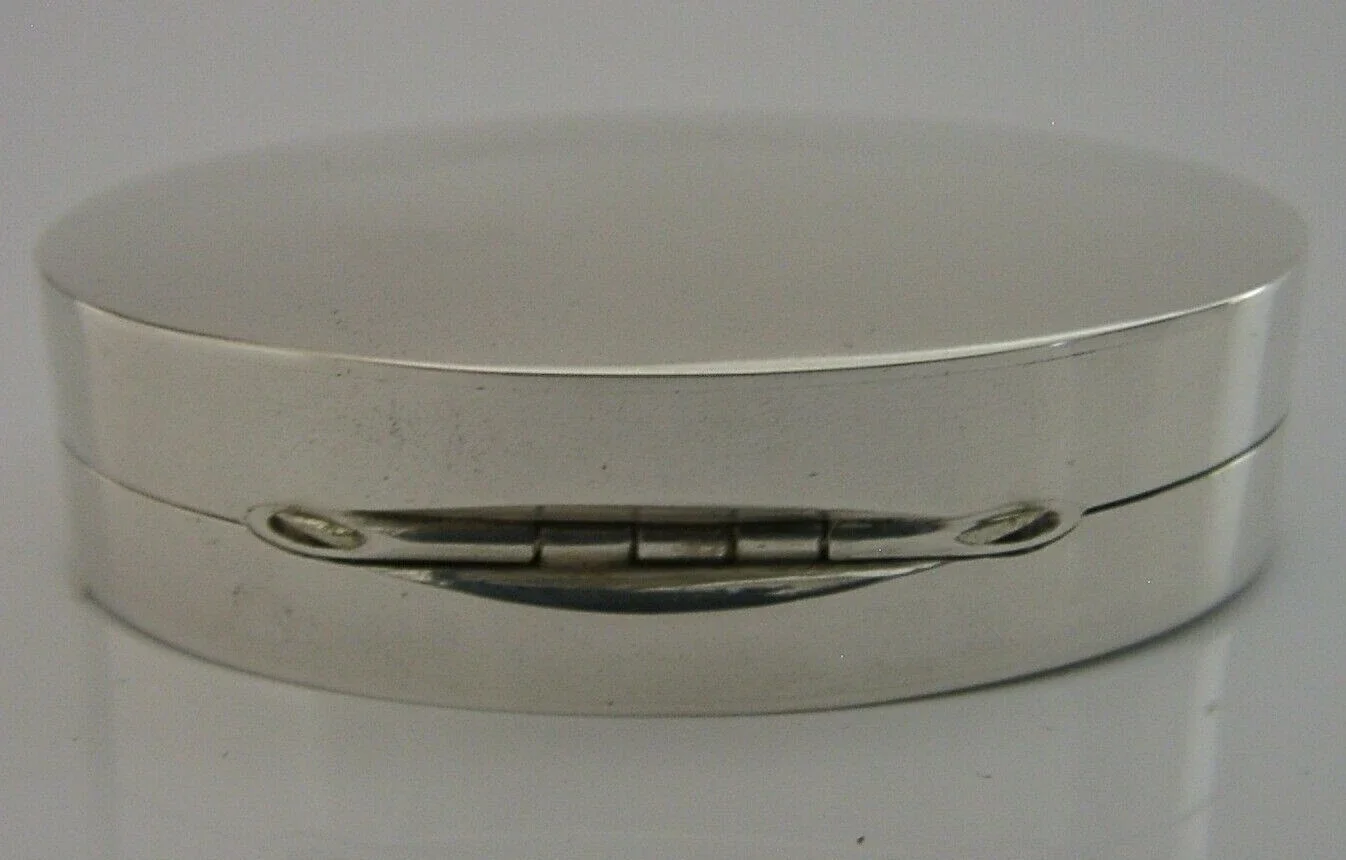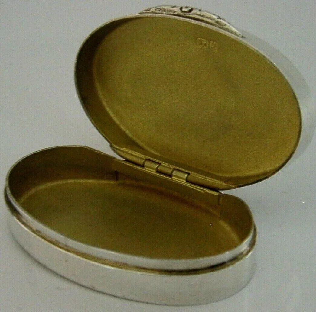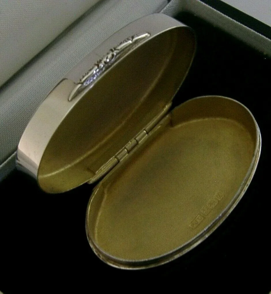 A super quality cased solid sterling silver snuff or pill box. It is hallmarked for Birmingham 1995 with the maker’s marks being PJD for Peter John Doherty, made for Gallagher's who had links to Aspreys and Garrards. It has a stylish oval design with cast catch and internally gilding. It is in super condition being free from dings splits distortions and repairs. The hinge is smooth and tight. The JJG (J J Gallagher) logo is on the base. It measures over 2 inches (5.2cms) across by 1.25 inches (3.2cms) wide by 1.3cms tall and weighs 36 grams (excluding the outer case). A very high quality example.