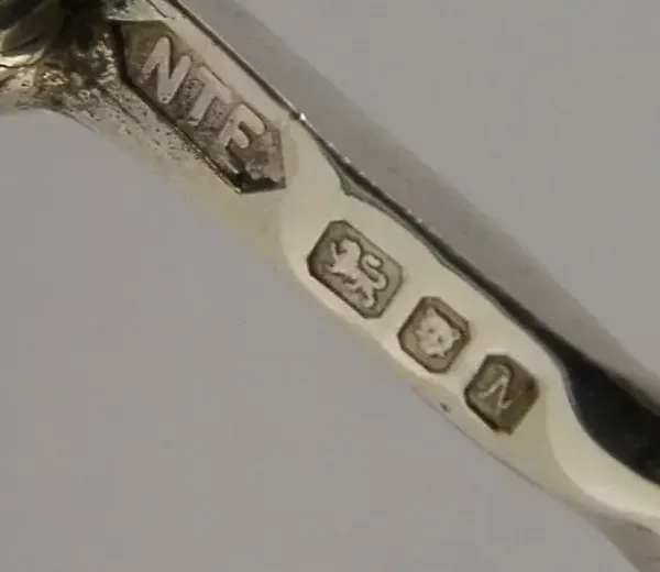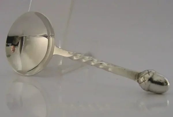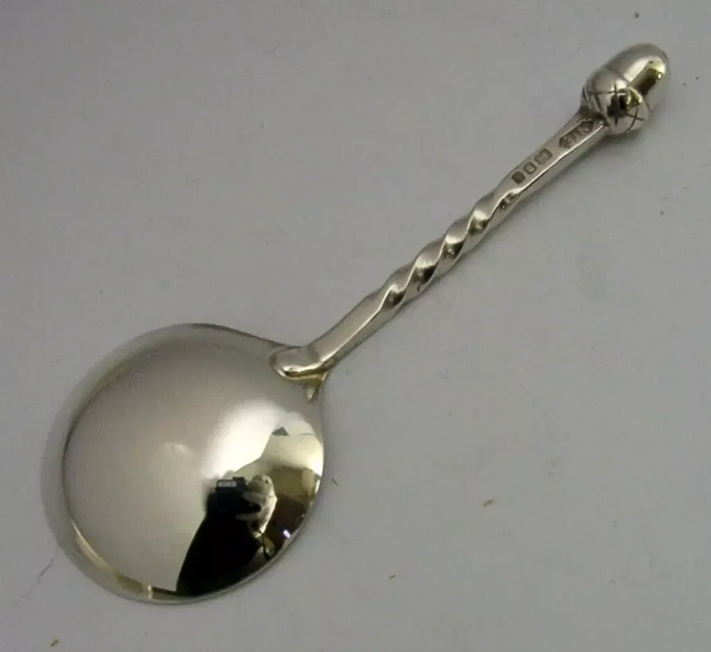 A nice quality English solid sterling silver caddy spoon. It is hallmarked for London 1987 with the maker being National Trust for England. It has been superbly designed with a spiral stem and acorn terminal. It is in super condition being free from dings splits distortions and repairs. It measures approx. 4 inches (10cm) long by 1.5 inches (3.8cm) wide and weighs 18 grams. A very nice clean example.