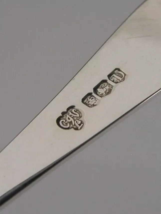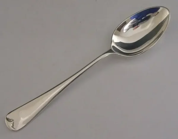 A superb English solid sterling silver replica spoon. It is hallmarked for Sheffield 1971 C J Vander Ltd. It has been superbly designed and is in super condition being free from dings splits distortions and repairs. It measures approx. 4.25 inches (11cm) long by almost 1 inch (2.4cm) wide and weighs 12 grams. A very unusual example.