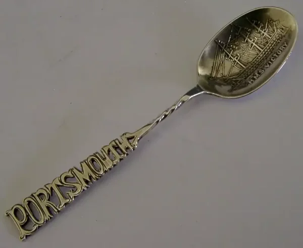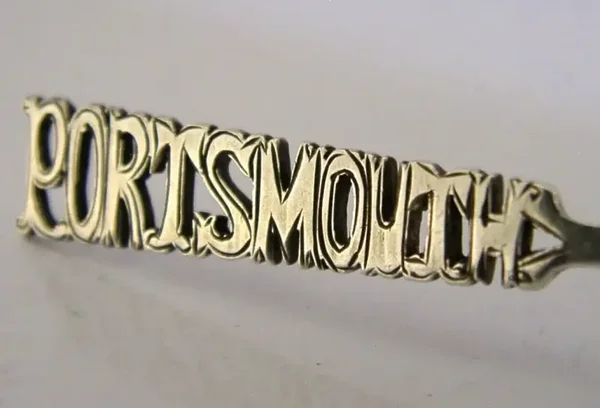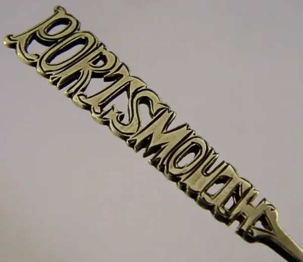 A very interesting antique solid sterling silver Portsmouth souvenir spoon. It is hallmarked for Birmingham with the date letter mark being pierced. I would date it to c1905. It was designed with the bowl depicting HMS Victory. It is in superb condition being free from dings splits distortions and repairs. It measures approx. 4 inches (10.3cm) long and weighs 8 grams. A very interesting piece.