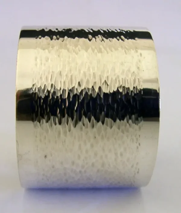 A very stylish hand made English solid sterling silver napkin ring. It is hallmarked for London 1988 with the makers marks being those of the designer Graham Watling. It has been superbly made being textured. It is in superb condition being free from dings splits distortions and repairs. It measures approx. 1.25 inches (3.3cm) tall by 1.75 inches (4.3cm) across and weighs 37 grams. A very nicely designed stylish piece.