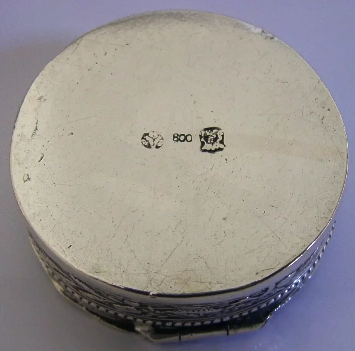 A very pretty German Hanau solid silver table snuff or trinket box. It is hallmarked with German Hanau marks along with the 800 silver standard mark. It has been superbly made being embossed to the lid with cherubs. It is in super condition being free from dings splits holes and repairs, the inside is clean and the lid closes tightly. It measures approx. 2 inches (5cm) across by 0.5 inches tall and weighs 34 grams. A very pretty piece.