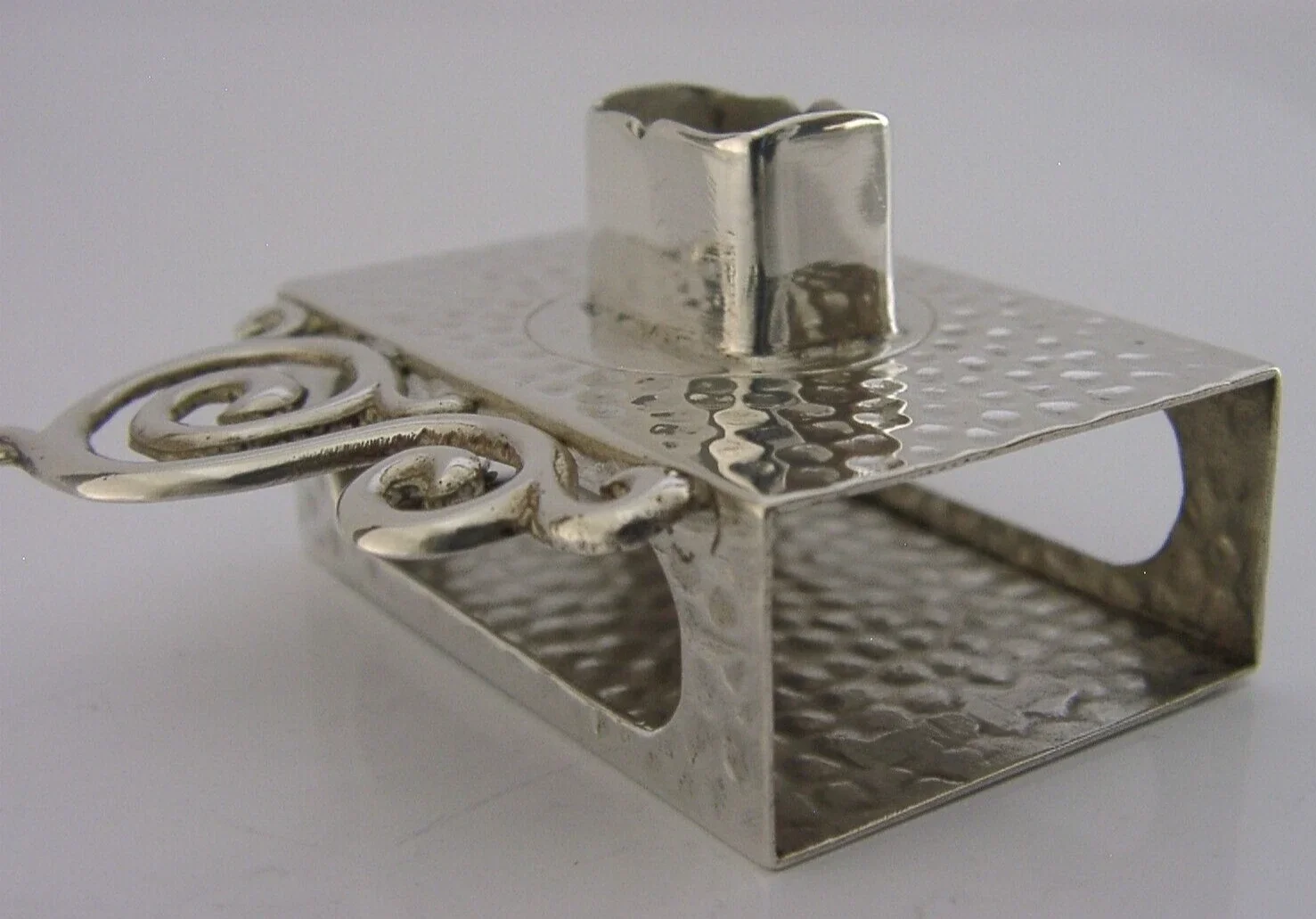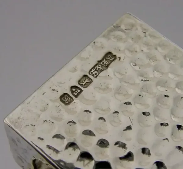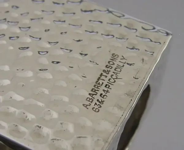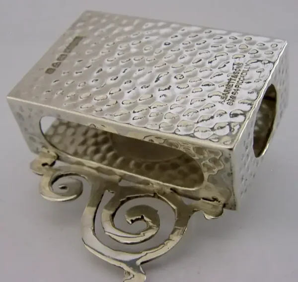 A beautiful rare Edwardian English antique solid sterling silver match box case and sealing wax holder. It is hallmarked for Chester 1901 with the makers mark being A Barrett. It has been superbly designed being plannished with an ornate handle and an area for holding a stick of sealing wax to its top (these wax sticks are still available on line). It is in superb condition being free from dings splits holes and repairs. It measures approx. 1.75 inches (4.5cms) by 2 inches (5cms) including the handle by 1.5 inches tall and weighs 26 grams. A very unusual example.