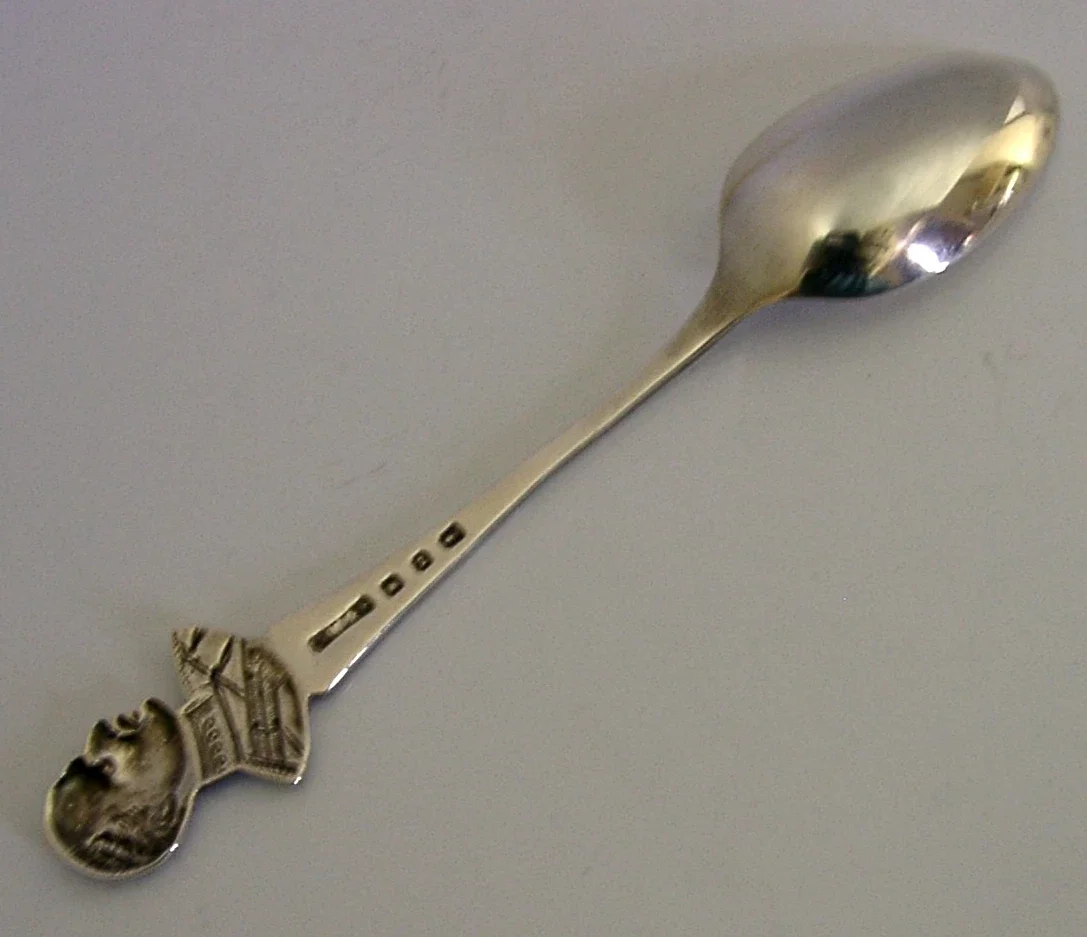 A nice quality English antique solid sterling silver military spoon. It is hallmarked for Birmingham 1899 with the makers mark being GW&S. It has been superbly designed with the terminal being in the form of one of the Boer War generals, possibly White or Hamilton? It is in super condition being free from dings splits distortions and repairs. It measures approx. 4.75 inches (11.8cm) long and weighs 12 grams. A very nicely designed piece.