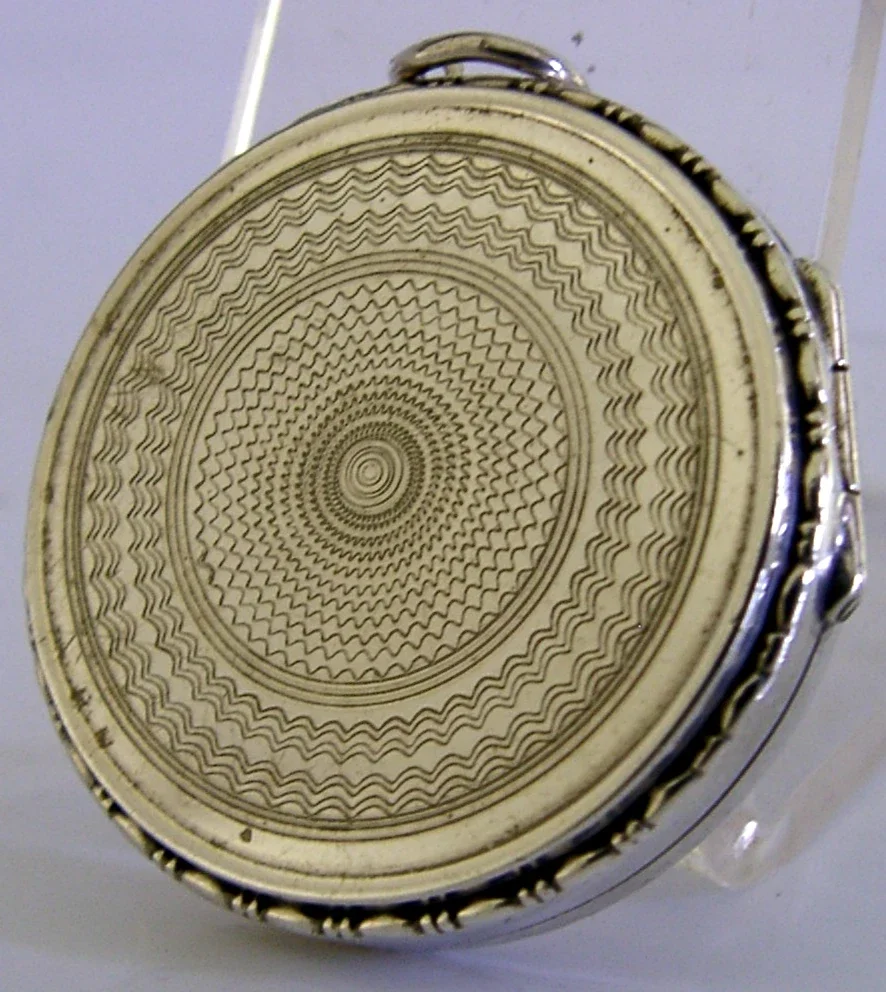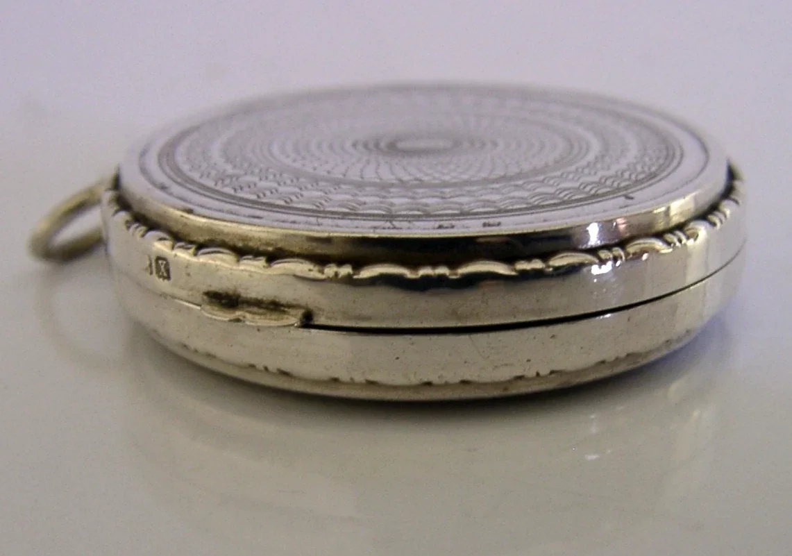 A beautiful English solid silver box. It is hallmarked for Birmingham 1922 with the makers marks being C&N. has been superbly made being of circle form with both side being engine turned in a style of 100 years previous. It is in super condition being free from dings splits holes and repairs, the inside is clean and it closes tightly. It measures approx. 1.5 inches (3.6cms) across and weighs 11 grams. A very pretty high quality piece.