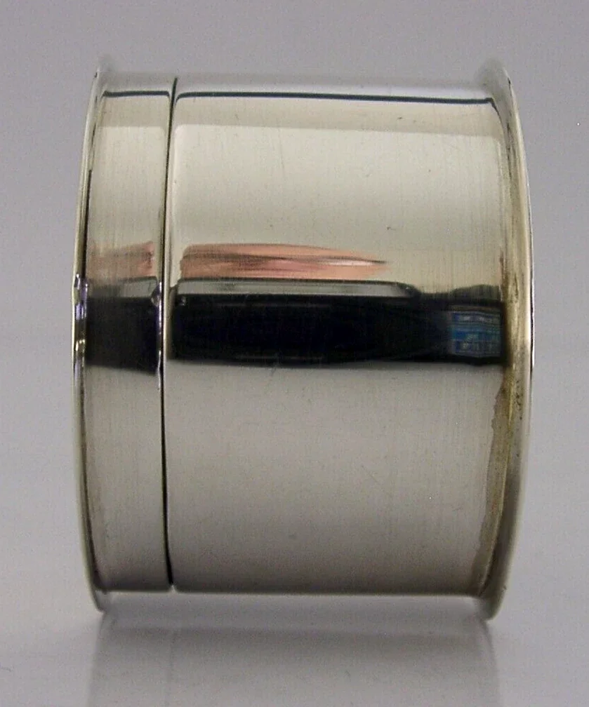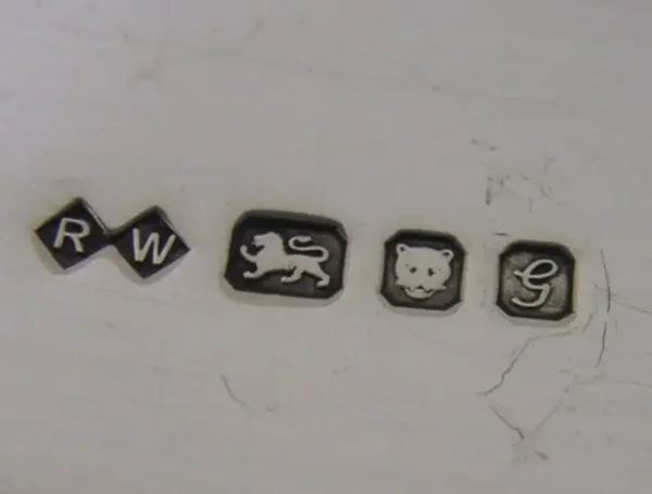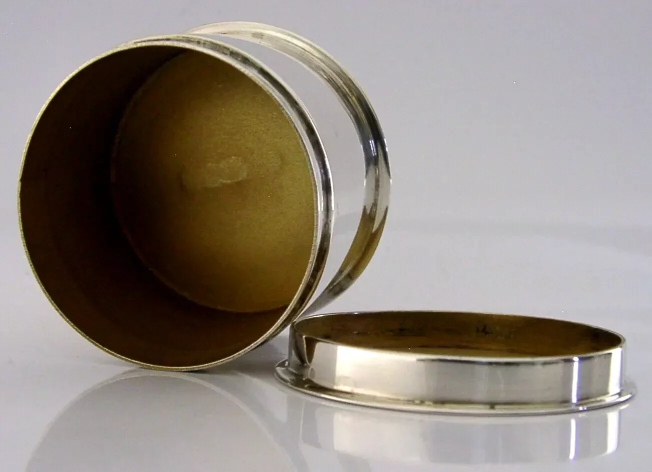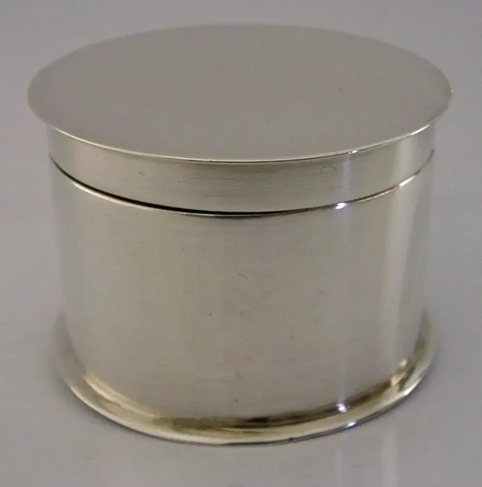 A very stylish English antique solid sterling silver dressing table trinket or desk box. It is hallmarked for London 1981 with the makers marks being RW. It has been superbly designed and the inside is gilded. It is in super condition being free from dings splits holes and repairs, the inside is clean and gilded the top fits tightly. It measures approx. 2 inches (5cm) across by 1.25 inches (3.4cm) tall and weighs 68 grams. A very well made clean piece.