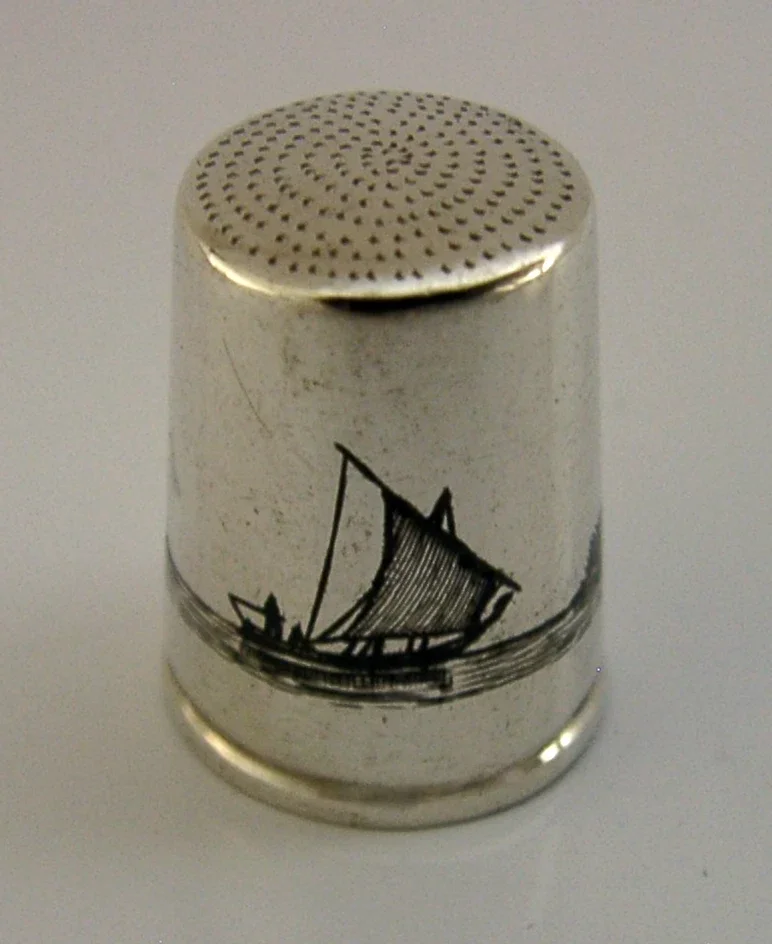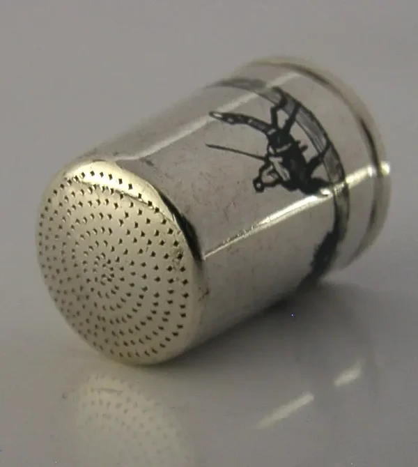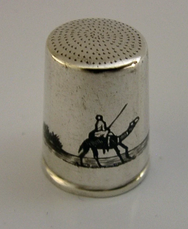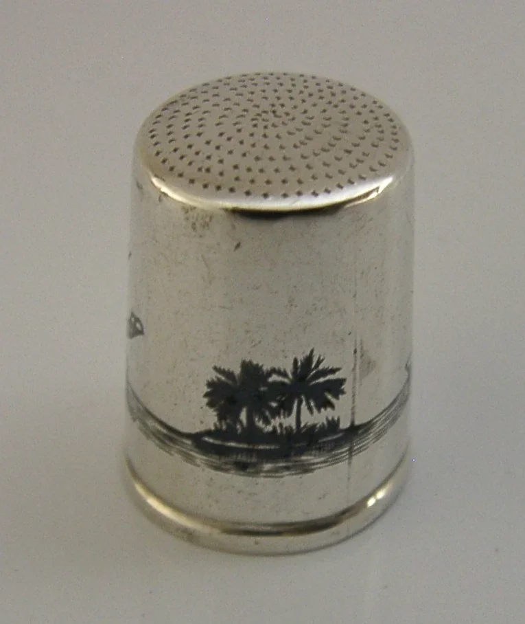 A rare Eastern Iraq antique solid silver niello thimble. It is unmarked but tests as high grade silver and I would date it to c1920. It has been superbly designed and is in super condition having no dings splits distortions or repairs. It measures over 0.75 inch (2.1cm) long by over 0.5 inch (1.6cm) across the base and weighs 6 grams. A rare high quality piece.