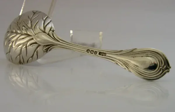 A rare English Victorian antique solid sterling silver caddy spoon. It is hallmarked for Sheffield 1896 with the maker being James Dixon & Sons Ltd. It has been superbly designed with the bowl being in the form of a leaf. It is in super condition being free from dings splits distortions and repairs. It measures approx. 4.25 inches (10.8cm) long by 1.25 inches (3.4cm) wide and weighs 22 grams. A very nice example.