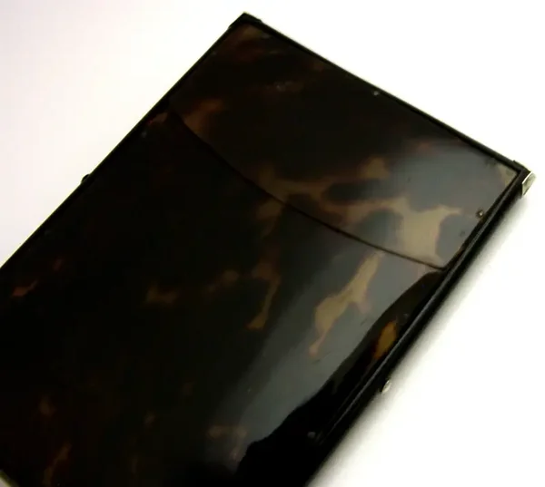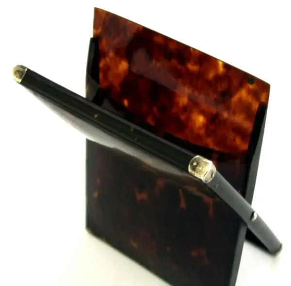 A beautiful antique sterling silver and faux tortoiseshell card or cigarette case. It is unmarked but test as high grade silver. I would date it to c1920s. It has been beautifully made having a faux tortoiseshell having silver mounted corners. It is in super condition being free from dings splits and repairs. It measures over 4 inches (10.2cm) long by almost 3 inches (7.4cm) wide and weighs 24 grams. A beautifully designed piece.