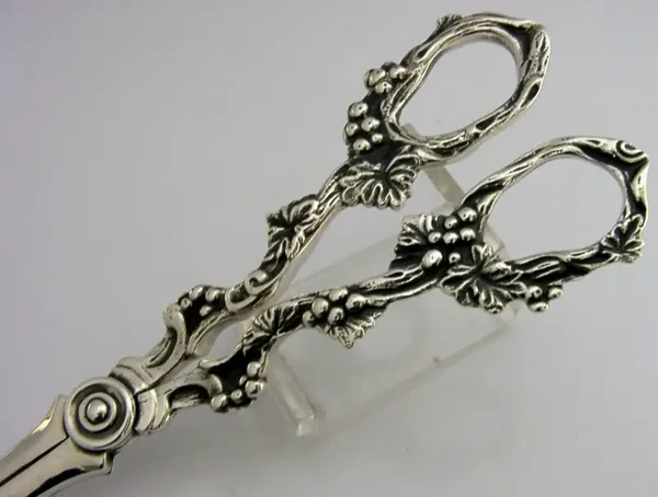 Very high quality rare Irish solid sterling silver grape shears. They are hallmarked for Dublin 2001 with the maker being DRC. They have been superbly made with the handles being cast with grape vines. It is in superb condition being free from dings splits distortions and repairs. They measure approx. 6.25 inches (15.8cm) long by over 2.25 inches (6cm) wide at the handles and weigh 104 grams. Superbly made very high quality examples.