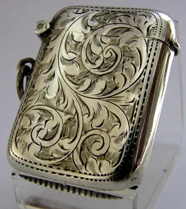 A quality English Edwardian antique solid sterling silver vesta case. It is hallmarked for Birmingham 1911 with the maker being Joseph Gloster Ltd. It has been superbly designed and the cartouche is free from any engravings. Note it is left handed having the hinge on the right. The inside has been internally gilded. It is in super condition being free from dings splits holes and repairs. It measures approx. 2 inches (5.1cm) wide by 1.5 inches (3.8cm) and weighs 26 grams. A beautifully made piece.