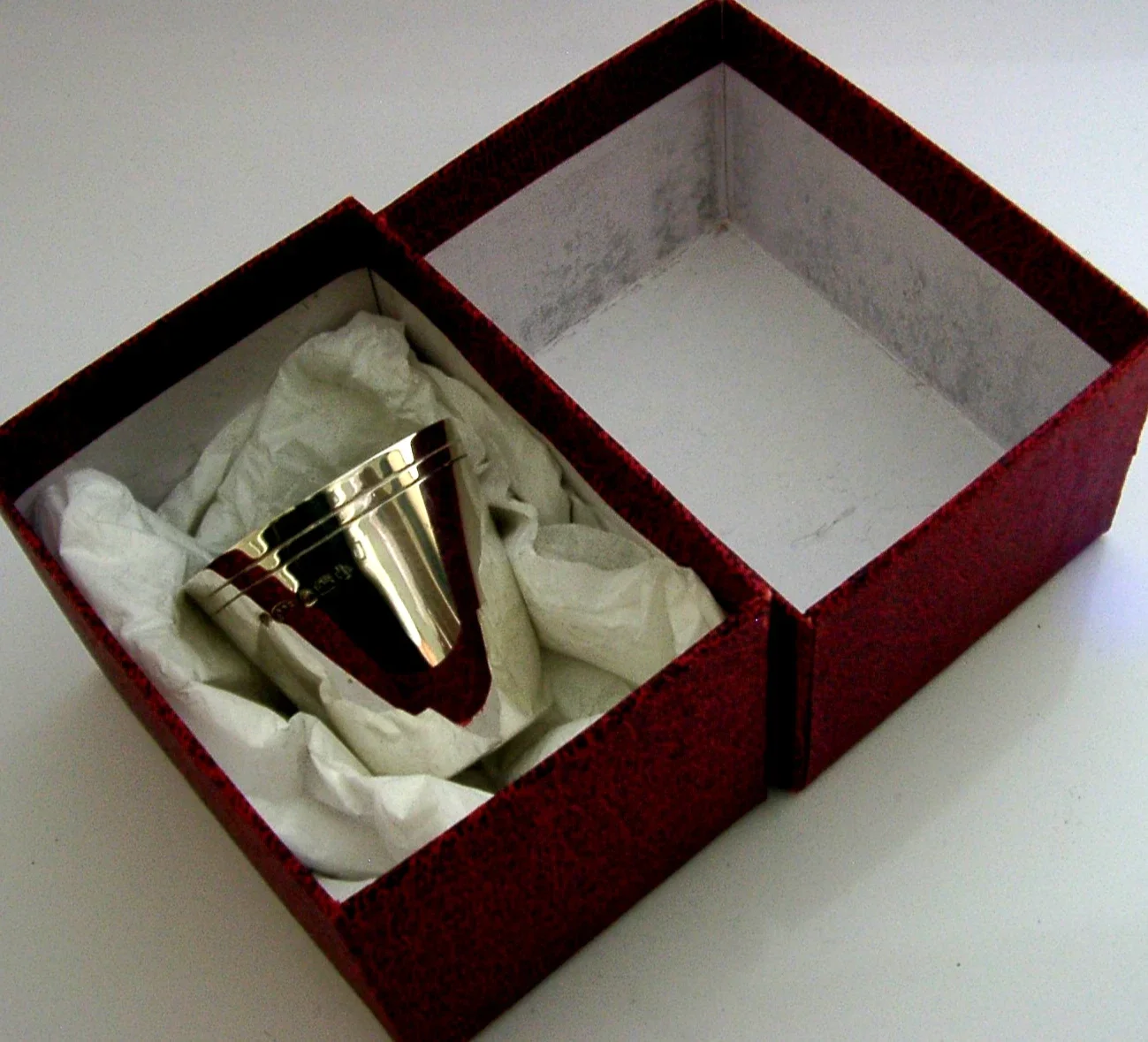A nice quality boxed English solid sterling silver tot cup. It is hallmarked for Sheffield 2000 with the maker being Carr's of Sheffield Ltd. It has been superbly designed and is in superb condition being free from dings splits holes distortions and repairs, tiny mark to the bottom edge - see final photo. It measures approx. 1.75 inches (4.4cm) tall by over 1.75 inches (4.8cm) across the rim by over 1 inch (2.6cm) across the base and weighs 26 grams excluding the box. A stylishly made piece.