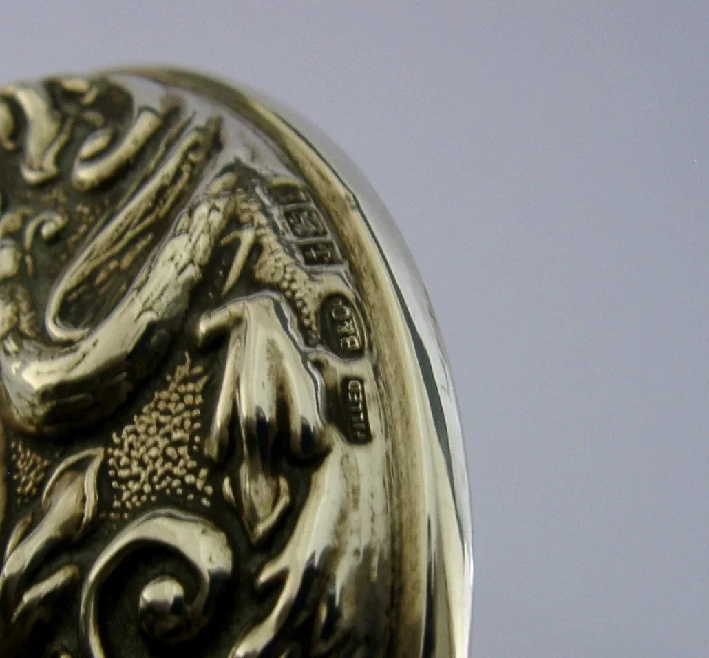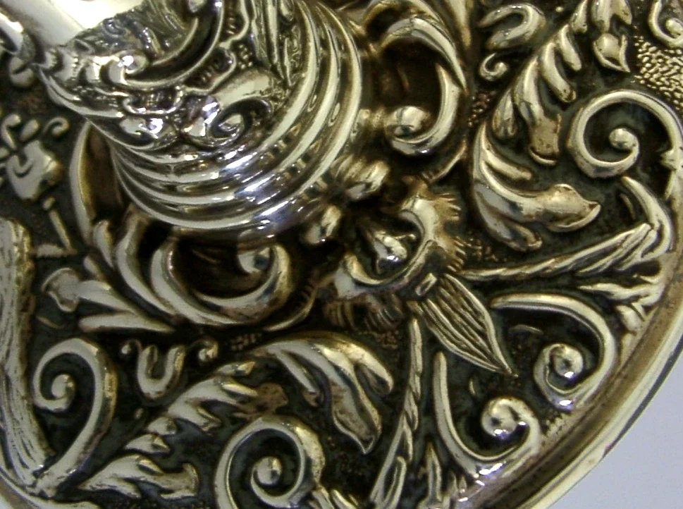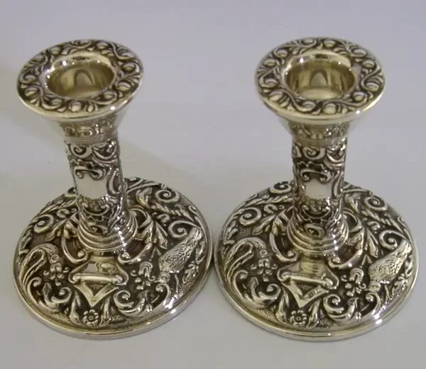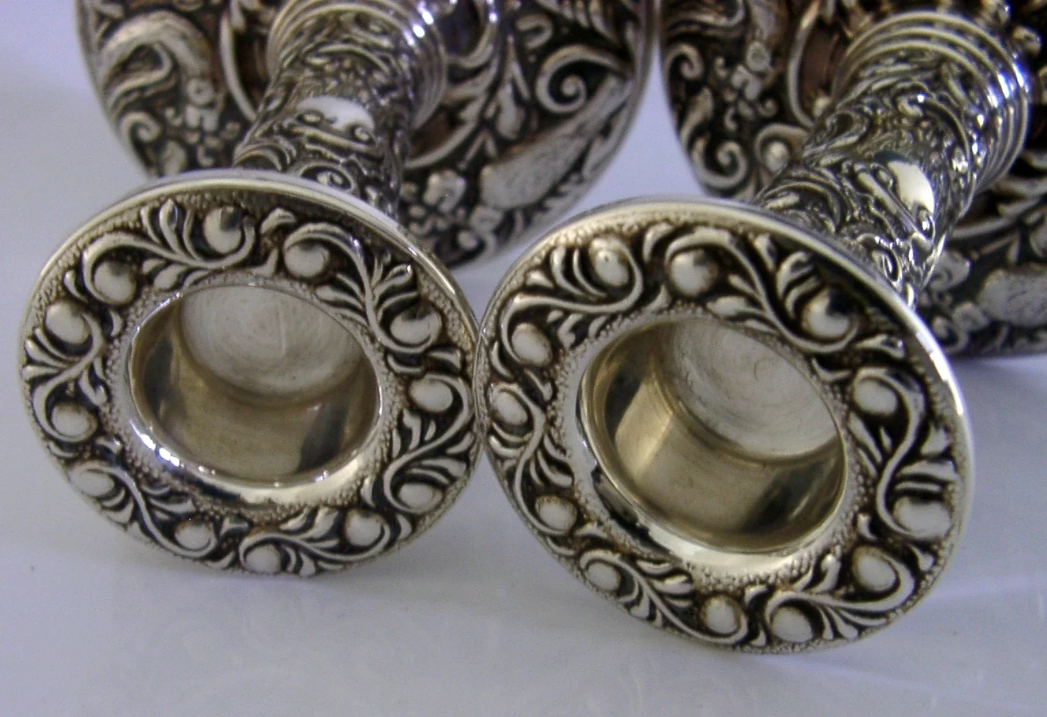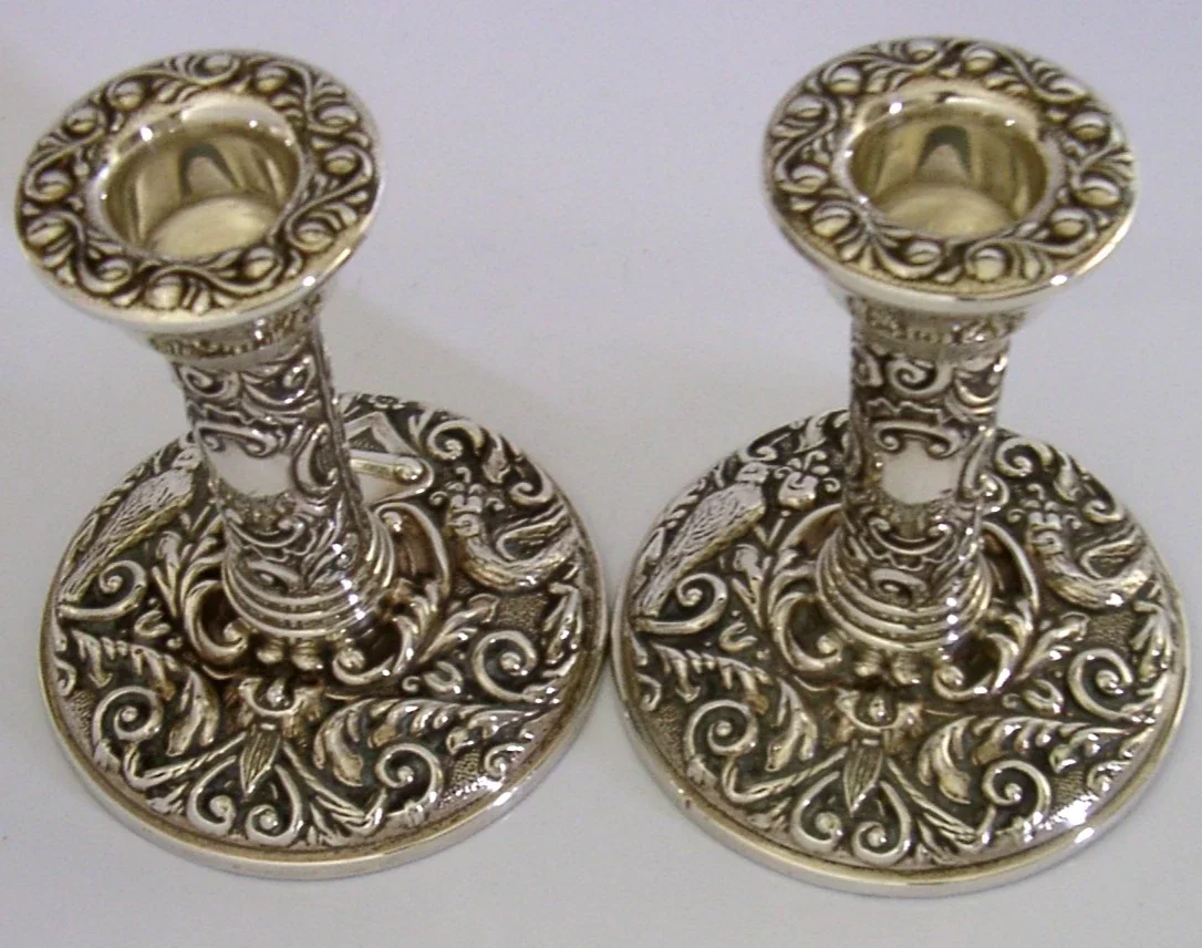 A very pretty pair of English sterling silver candlesticks. They are hallmarked for Birmingham 1984 with the makers marks being B&Co. They have been beautifully embossed with birds, leaves, and the face of the Greenman. They are in superb condition being free from dings splits holes and repairs, one tiny mark on the cartouche - see final photo. It measures approx. 3.5 inches (8.7cm) across their bases by 4 inches (10cms) tall and combined weigh 310 grams (they are plaster weighted). A beautifully made very stylish pair.