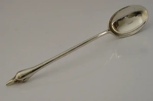 A rare very nice quality English solid sterling silver spoon. It is hallmarked for Sheffield 1989 with the maker being Jack Spencer (Silversmith) Ltd. It has been superbly designed with the terminal being in the form of a swans head. It is in super condition being free from dings splits distortions and repairs. It measures almost 5 inches (12.5cm) long by over 0.75 inch (2.4cm) and weighs 12 grams. A very nicely designed piece.