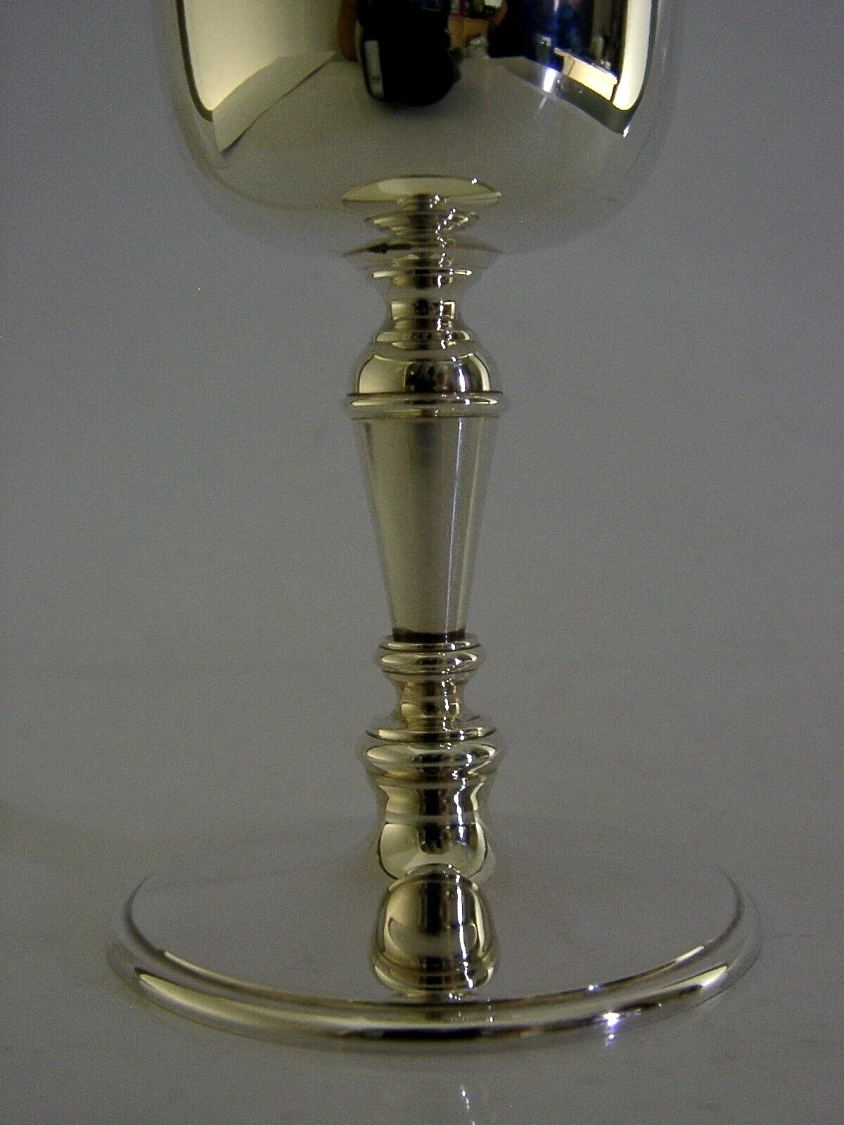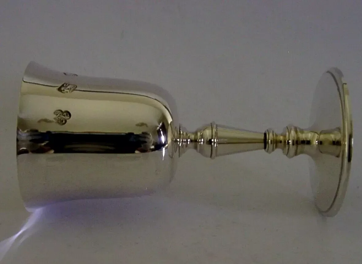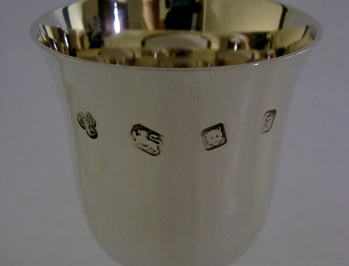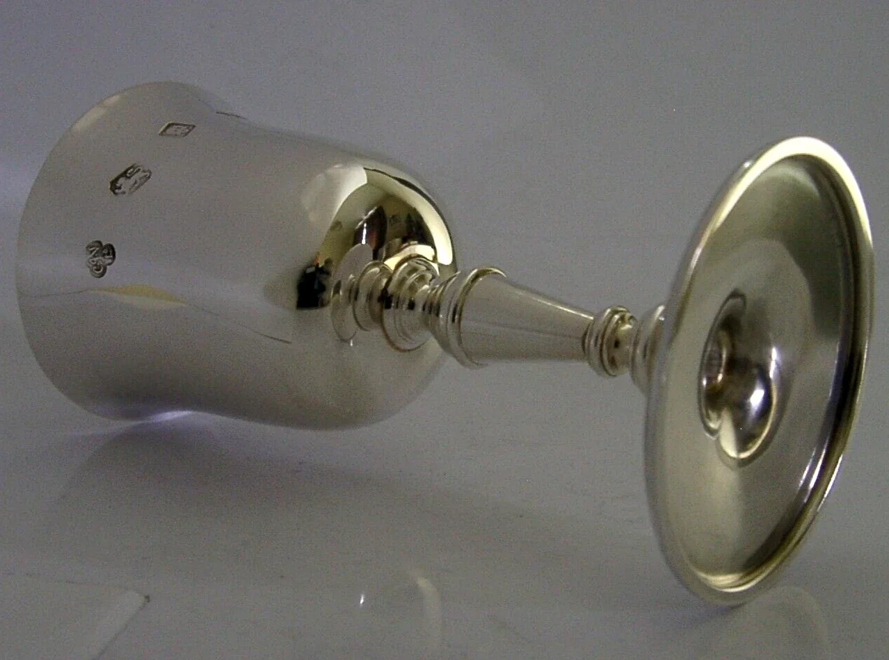 A super quality English solid sterling silver goblet. It is hallmarked for London 1974 with the makers mark being that of C J vander. It has been superbly designed and holds 50ml. It is in super condition being free from dings splits distortions and repairs. It measures approx. 4.25 inches (10.6cm) tall by over 2 inches (5.6cm) across the rim and weighs 100 grams. A very good quality piece.